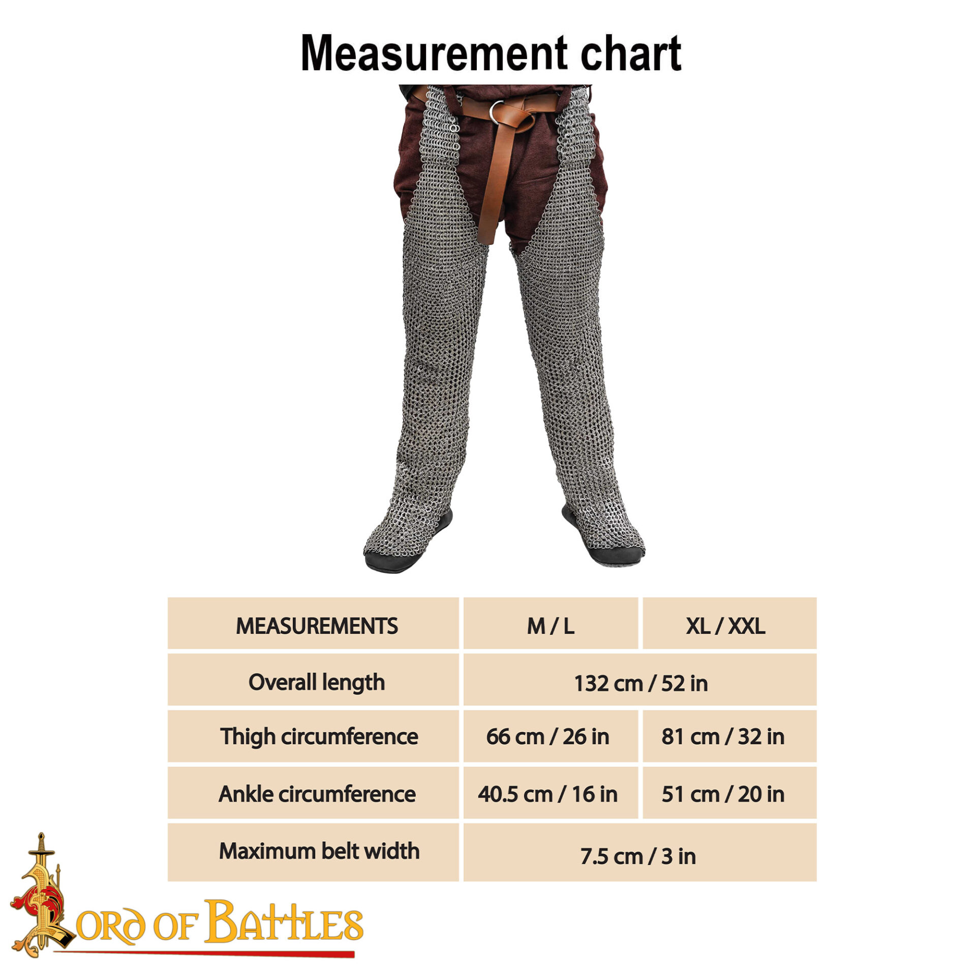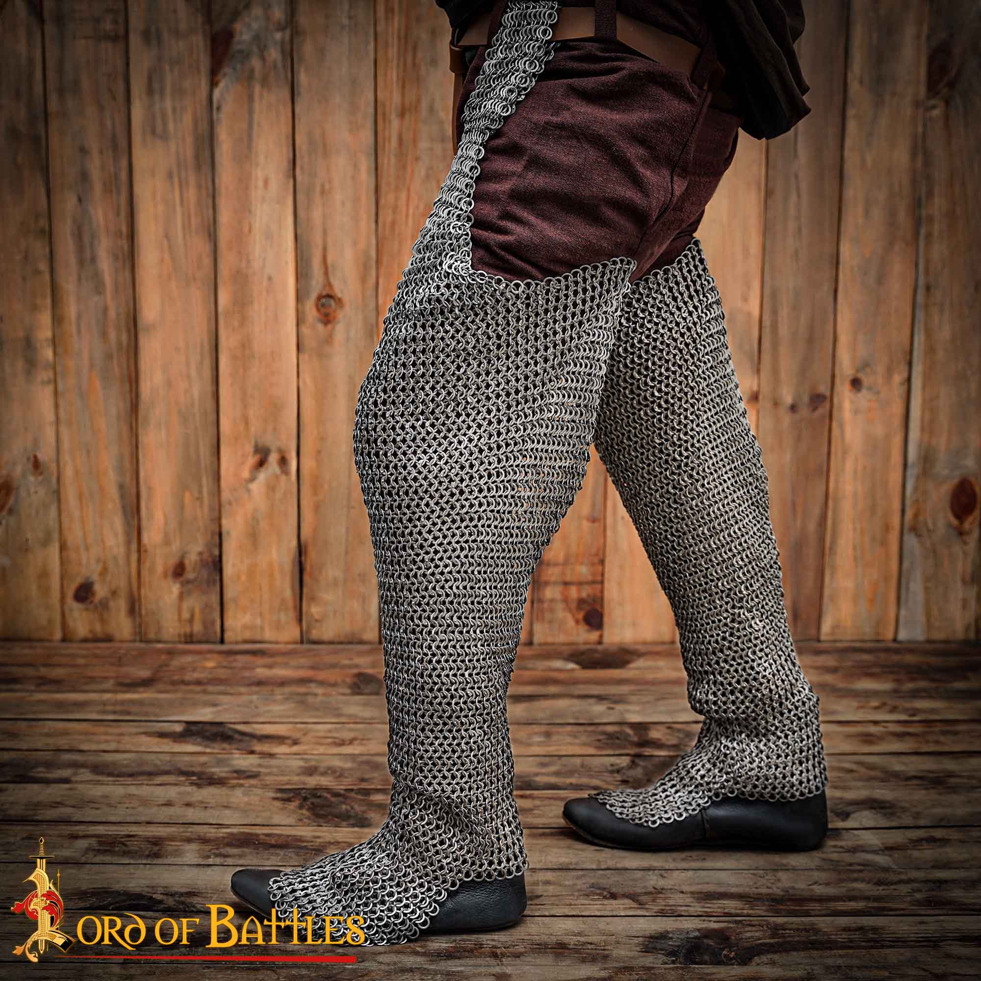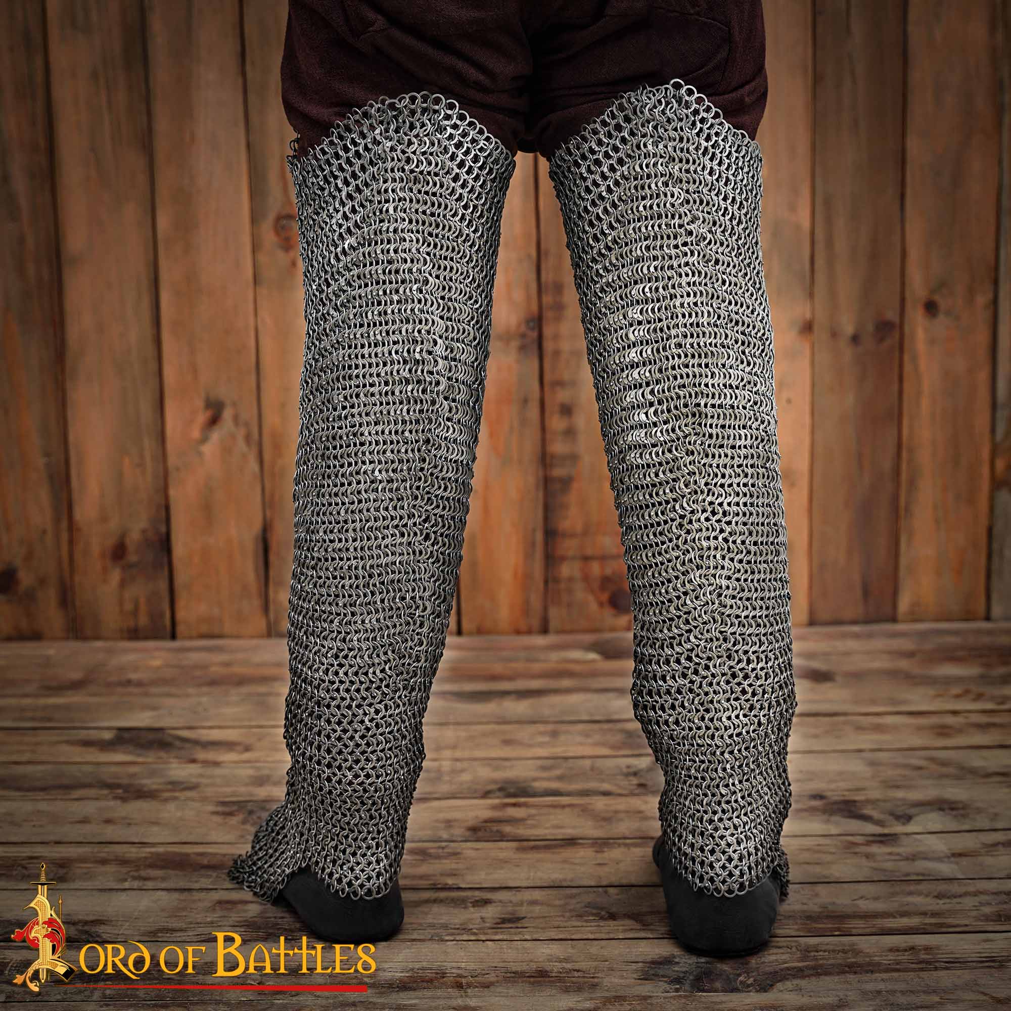 Each pair of mail chausses is assembled by hand using traditional riveting techniques. Minor variations in pattern, texture, or ring tension may occur and are a natural result of handcrafted production, lending authenticity to your armor.