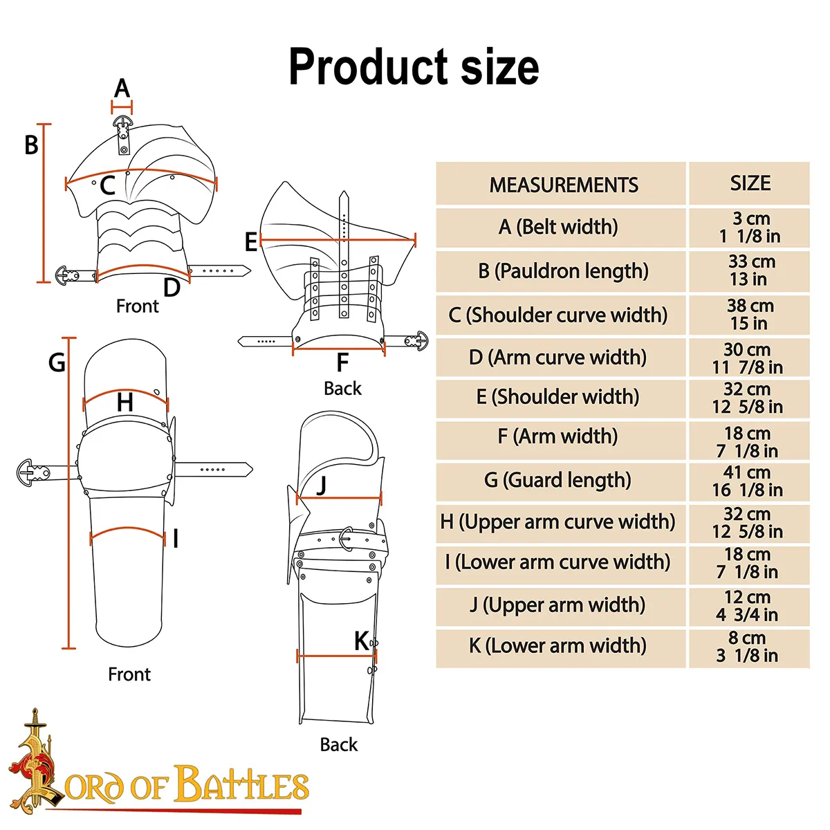 At approx. 6.5 kg, this set provides excellent protection without weighing the wearer down. Secured with sturdy leather straps and buckles, it fits snugly over a gambeson or arming doublet, just as historical warriors would have worn it. Whether used for reenactments, SCA combat, LARP, or as part of a complete Gothic harness, this arm defense Armour Set will make a striking addition to any kit.