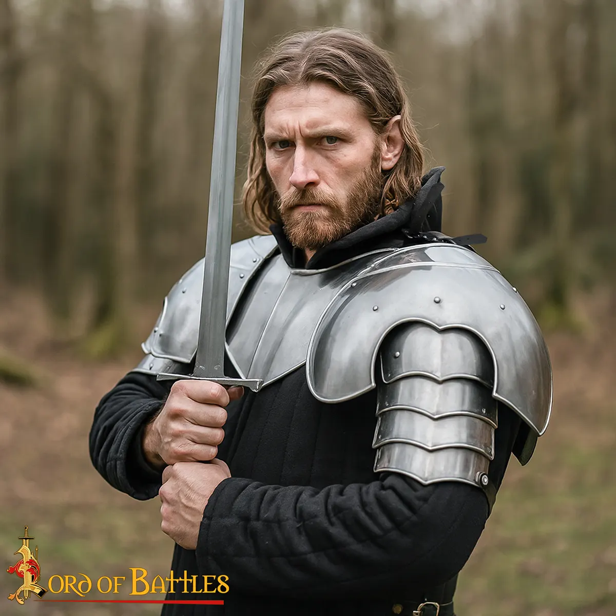 The rounded shoulder plates flow into overlapping lames that extend down the upper arm, providing excellent coverage while still allowing freedom of movement. Adjustable leather straps and buckles make it easy to achieve a secure fit for most body types, whether worn on their own, attached to a gorget, or paired with a cuirass.