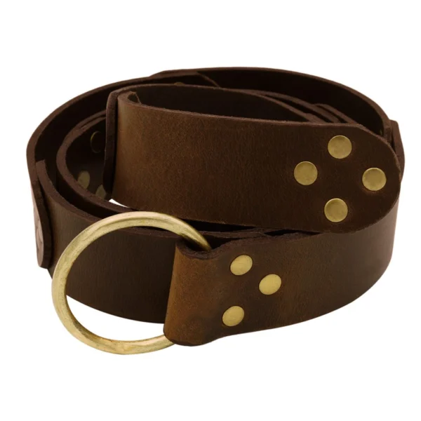 What truly makes this belt a standout piece is its remarkable structural integrity. Each component is secured with riveted leather plates and accented by pure solid brass rivets, combining robustness with visual appeal. The solid brass adds to the aesthetic charm while ensuring that this belt will retain its beauty and functionality for years to come. The brass ring serves not only as a practical fastening method but also as a captivating visual centerpiece that enhances any attire.