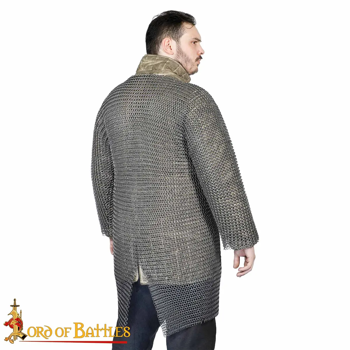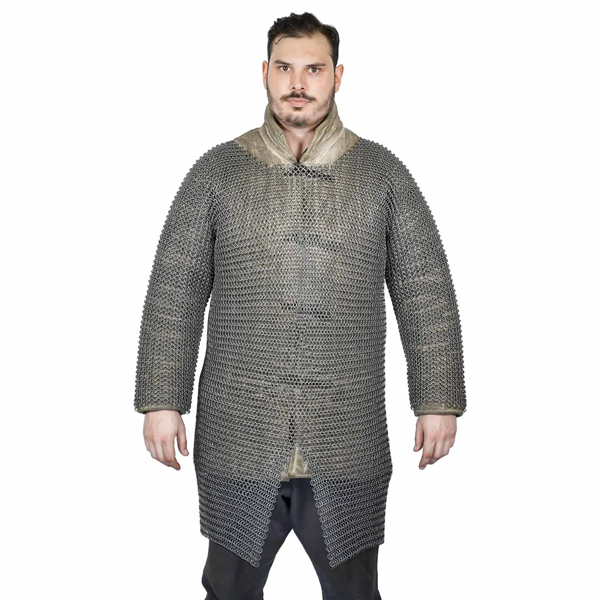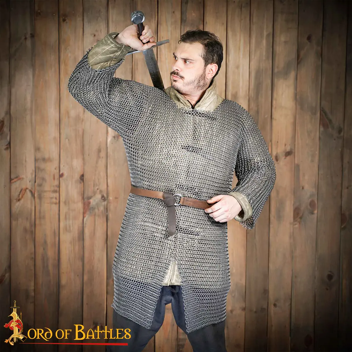 This hauberk provides full upper body protection, covering from shoulders to thighs, with long sleeves and a front split for easy movement while riding or kneeling. Each ring is interlinked in the classic European 4-in-1 pattern, a proven design used for centuries to balance durability and mobility.