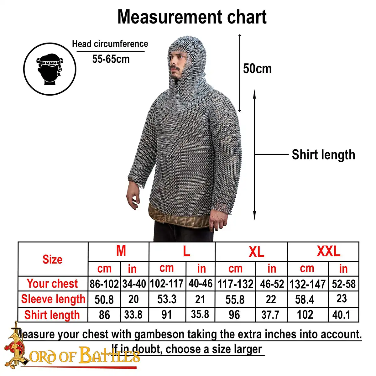 Accompanying the shirt is the V face chainmail coif/hood, an essential piece that adds an extra layer of protection while enhancing your medieval look. Designed to fit most head sizes, this coif can be worn underneath your favorite kettle hat for added safety or sported on its own for a more streamlined appearance. Its purpose goes beyond functionality; it embodies the spirit of adventure and the thrill of stepping into a world rich with tales of valor and knightly honor.