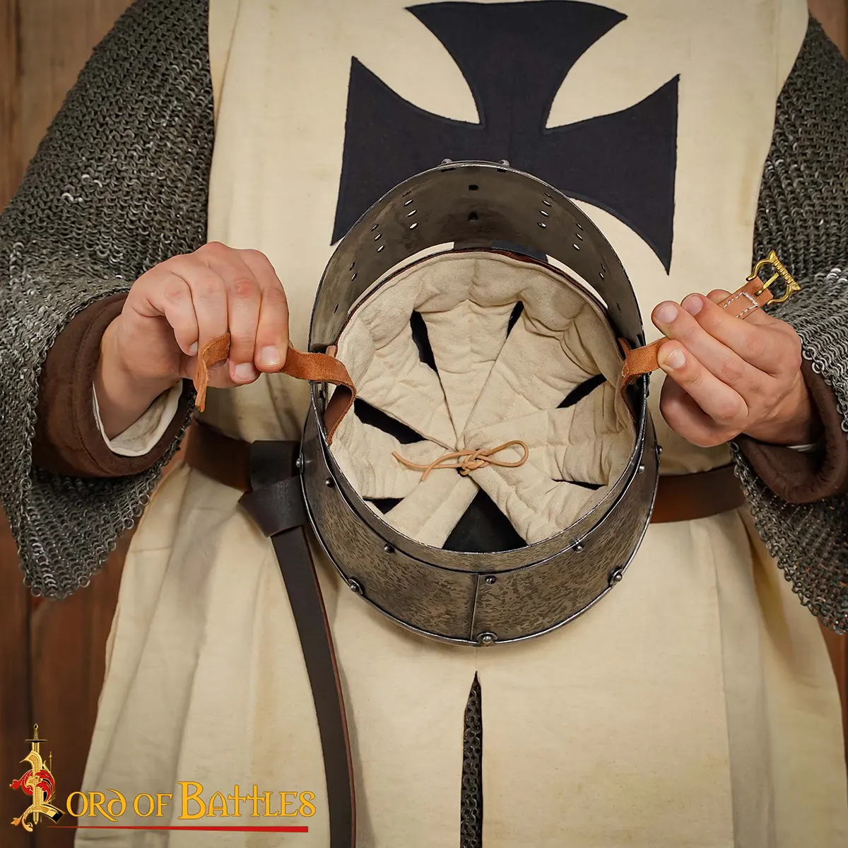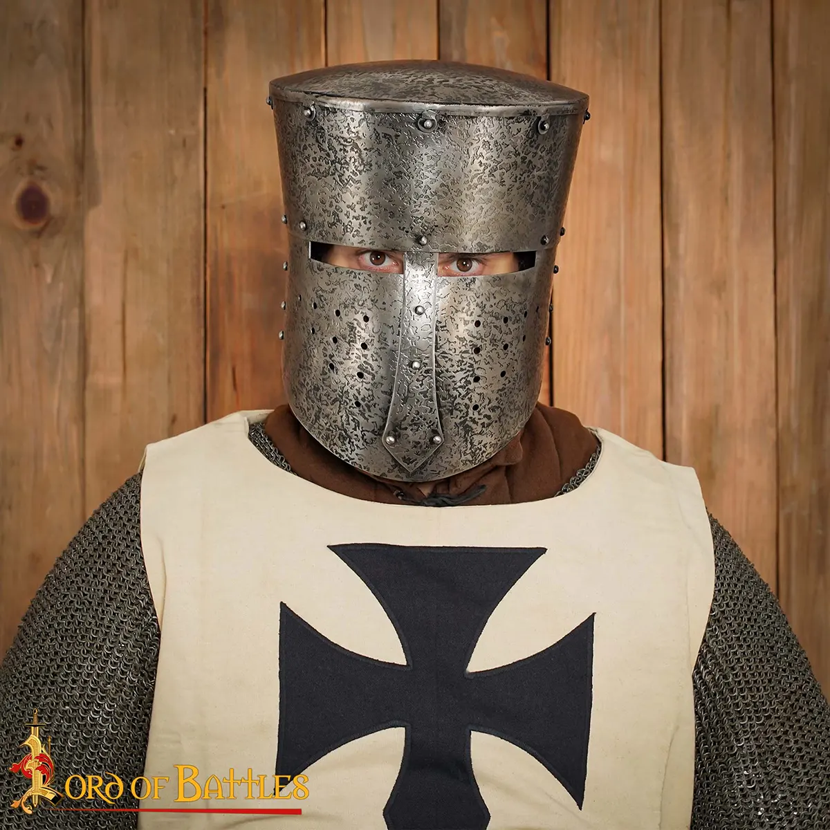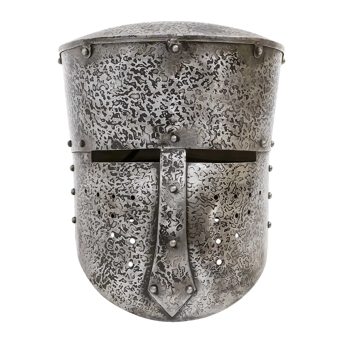 Ventilation is a vital feature when you’re donned for battle; the punched faceplate allows air to circulate, helping to stave off heat exhaustion when the stakes are high. Imagine swinging your sword through a fierce melee, shielding your face from arrows while remaining cool and focused! Directly inspired by a design seen upon a British Museum seal, this crusader helmet’s carefully modified ventilation holes ensure you can face your opposition with confidence.