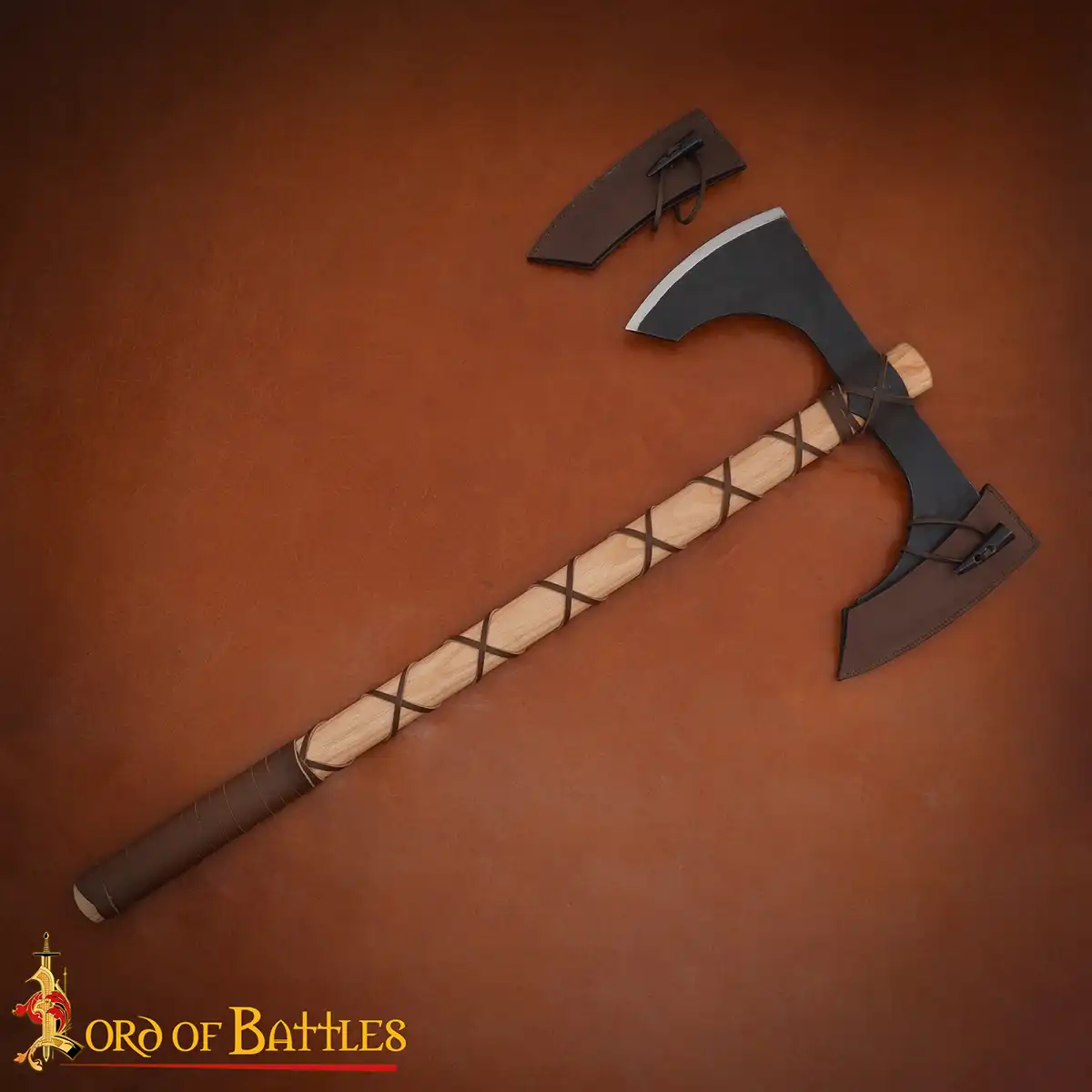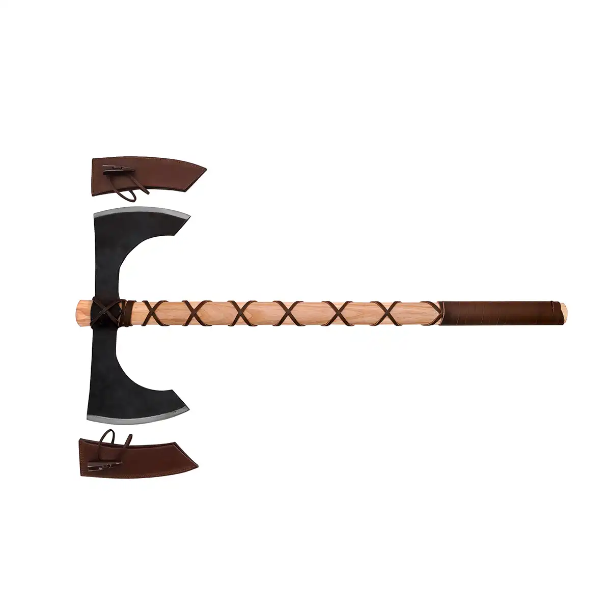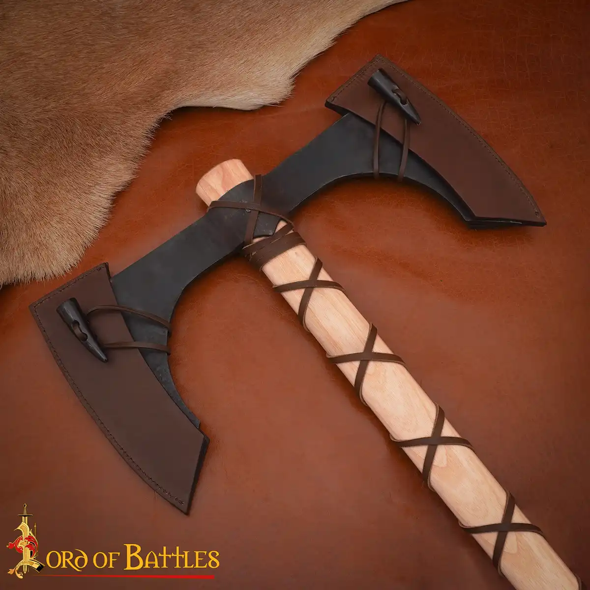 For safety and longevity, this axe includes two fitted leather sheaths, each secured with horn toggles—a historically inspired detail that enhances its medieval allure. Together, they protect the blades while adding to the authenticity of your kit.