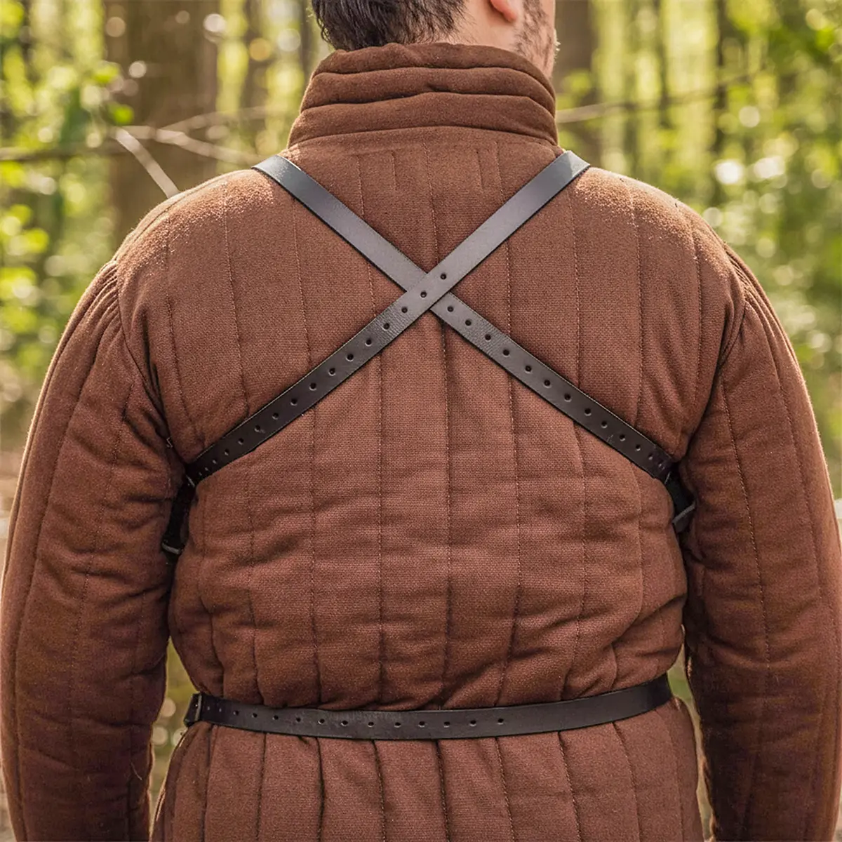 Crafted from 16 gauge mild steel, this breastplate provides excellent durability while keeping weight to a manageable 4 kg. Its Gothic-inspired design has strong lines and a slightly fluted form that both reinforces the steel and creates a commanding look on the field. The inside is polished smooth to help resist corrosion, while crossed leather straps and buckles at the back allow for a secure and adjustable fit.