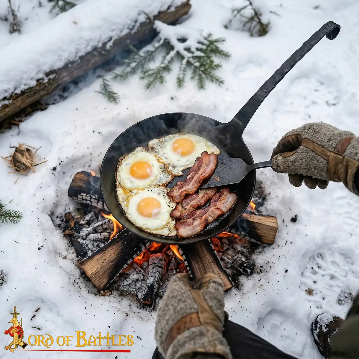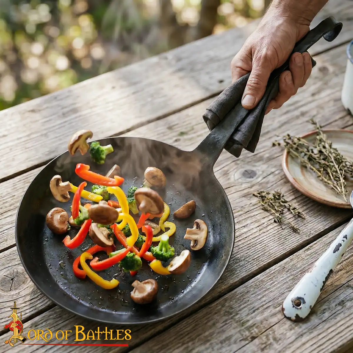 The sturdy hand-forged handle ensures safe use when cooking over flames and adds to the pan’s rugged medieval aesthetic. More than just cookware, this piece is a sustainable and chemical-free alternative to modern pans, designed to last a lifetime.