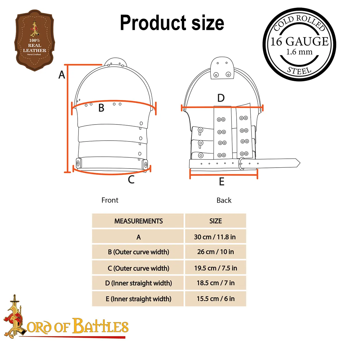 The adjustable fit is achieved through a set of durable leather straps equipped with iron buckles, allowing you to customize the fit to your body. This is an essential feature for those long days at medieval fairs, LARP events, or historical reenactments, where comfort is as vital as protection. The height of the pauldrons reaches an impressive 28 cm, providing ample coverage while allowing for maximum freedom of movement. The lowest end glows with a 20 cm long curve that gracefully follows the natural line of your shoulder. Meanwhile, the broadest width of approximately 25.5 cm gives added surface area without the bulk often associated with heavy armor.