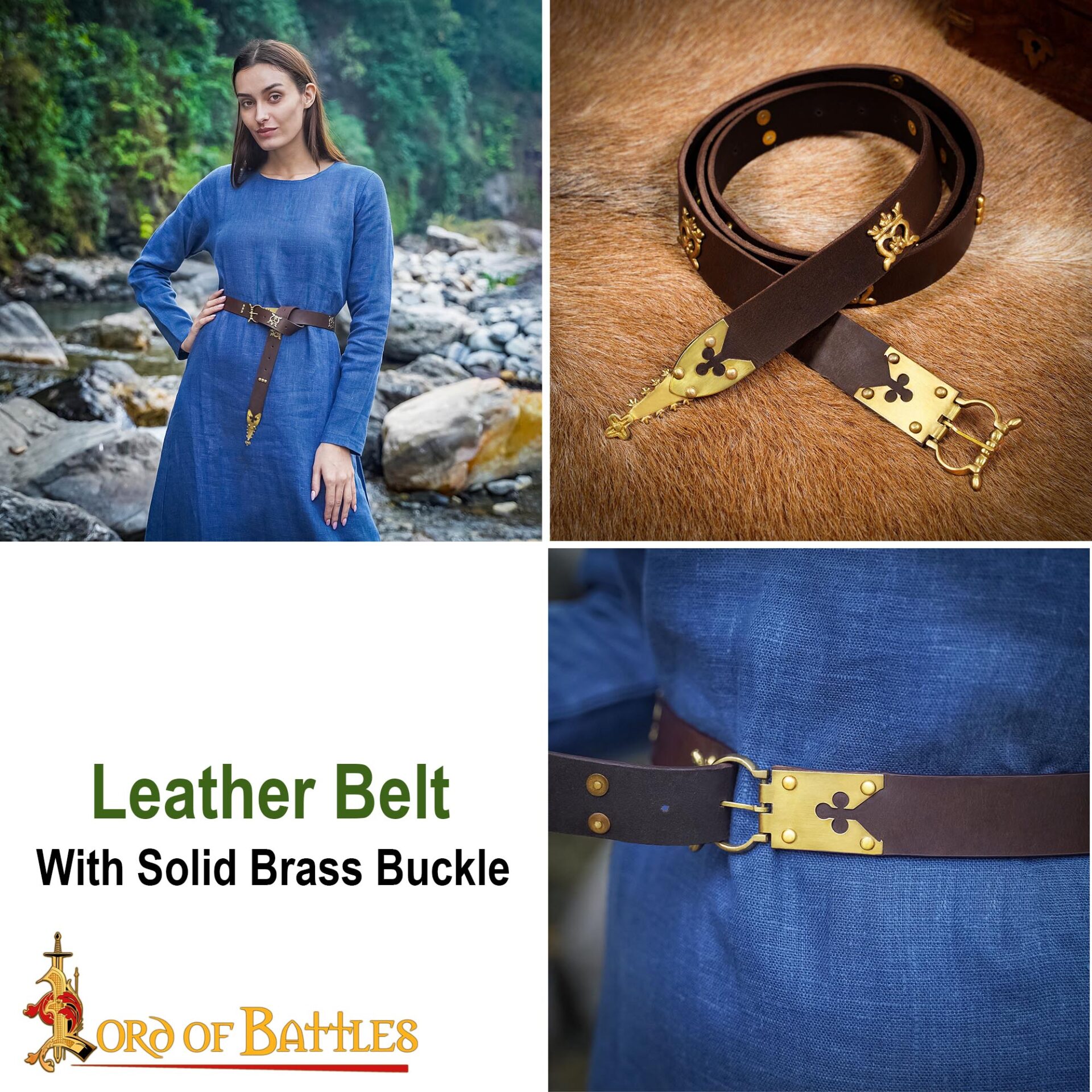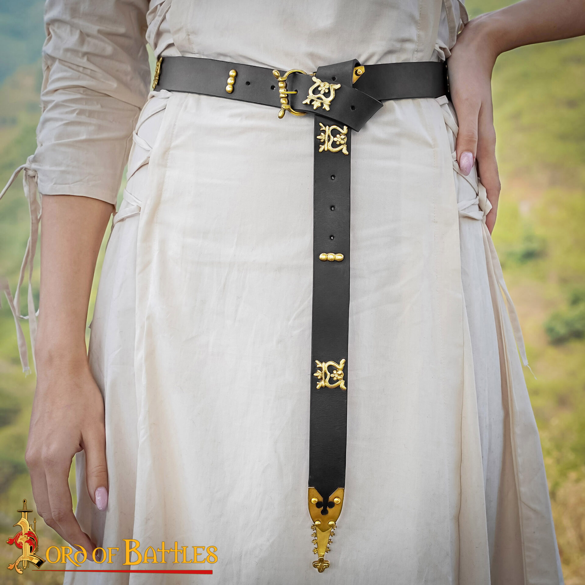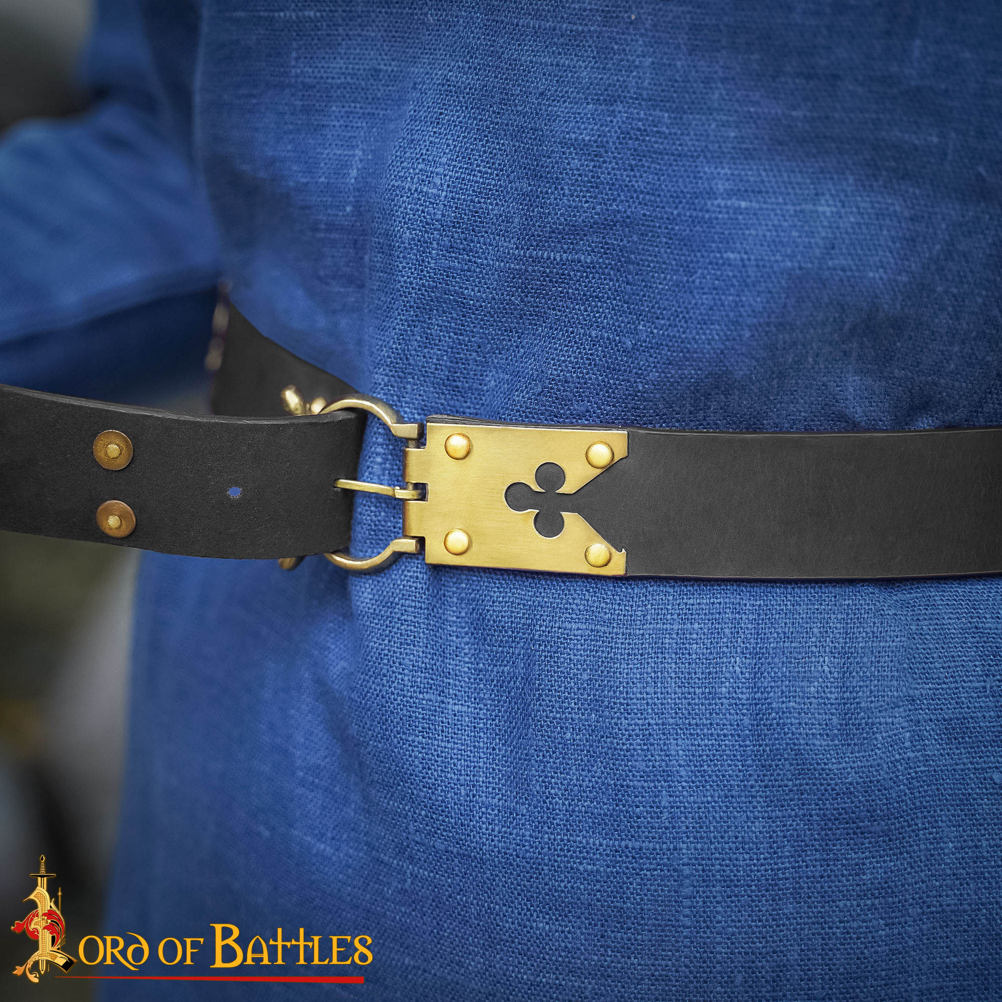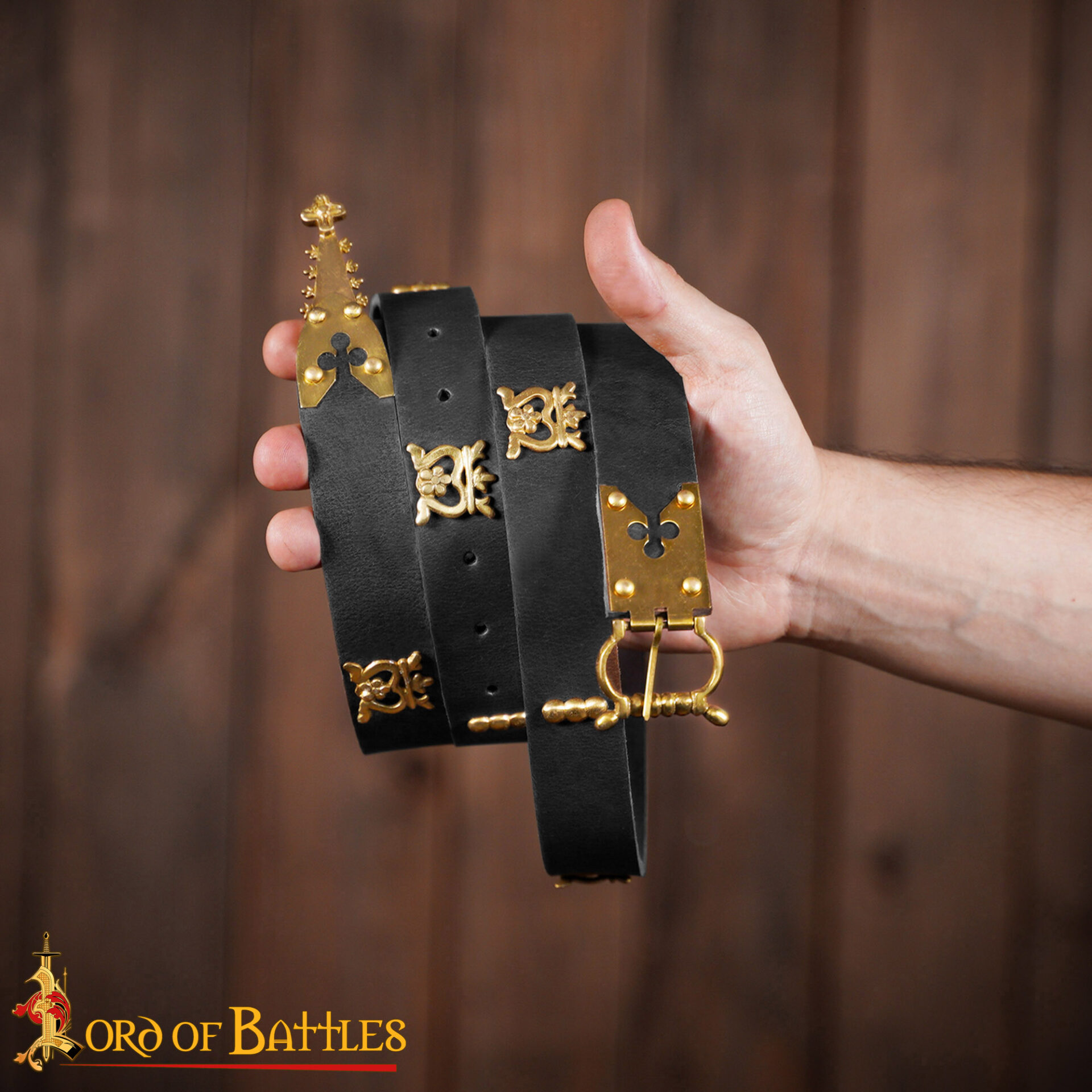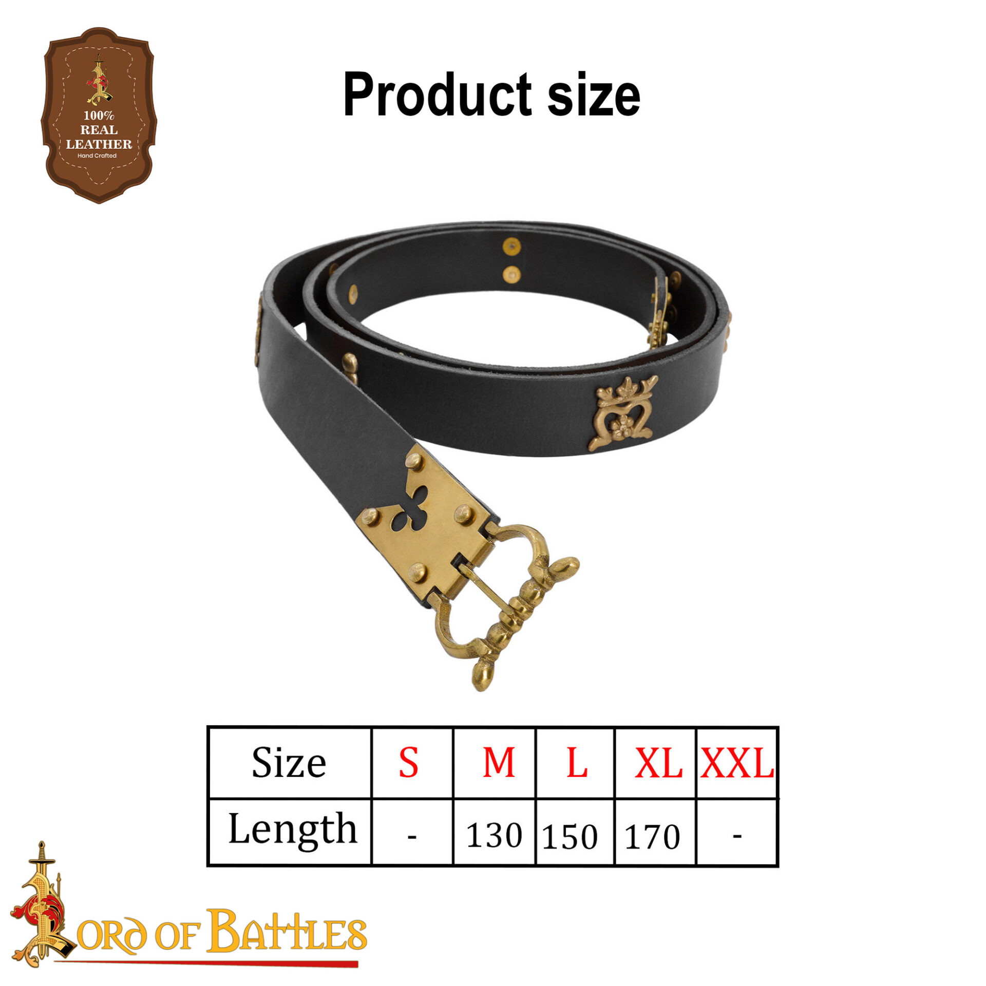 In the high medieval and early Renaissance era, belts were not just practical fasteners but statements of wealth, rank, and allegiance. This reproduction captures that tradition, combining genuine leather with heraldic brass fittings inspired by artefacts preserved in museums and illustrated in illuminated manuscripts.