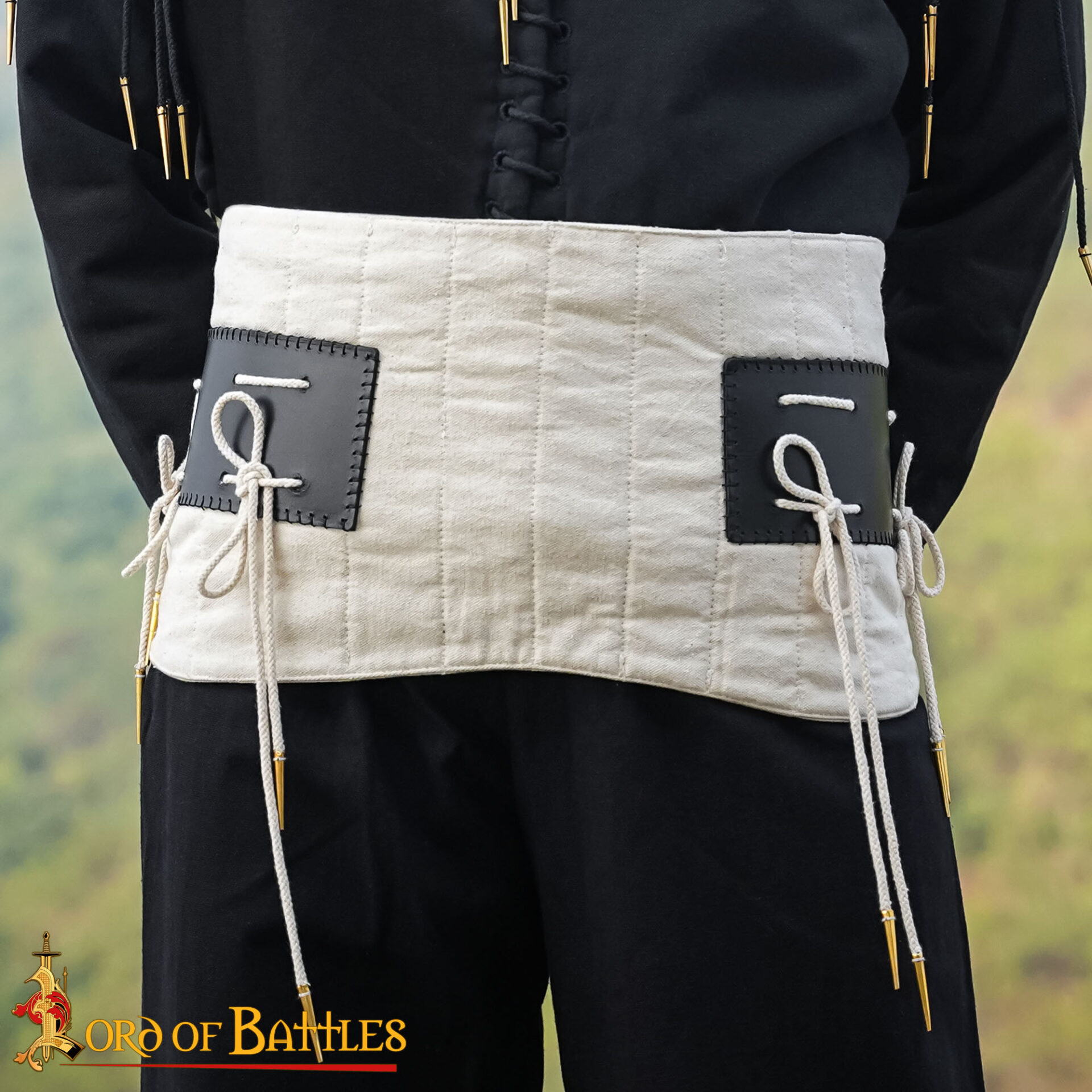This Medieval Padded Arming Belt piece features multiple rows of vertical quilting and sturdy leather panels where the lacing points are anchored, ensuring extra durability and preventing fabric wear at high-stress points.