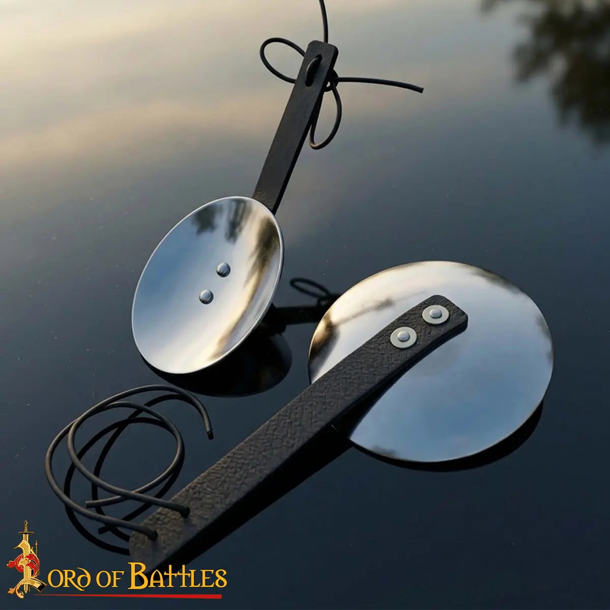 Our reproduction pair of Medieval Steel Rondels is hand-made from sturdy 16-gauge mild steel, providing both durability and historical authenticity. Each rondel is riveted to a long, genuine leather strap, making them easy to attach to gambesons, mail, or plate harnesses, just as warriors did centuries ago.