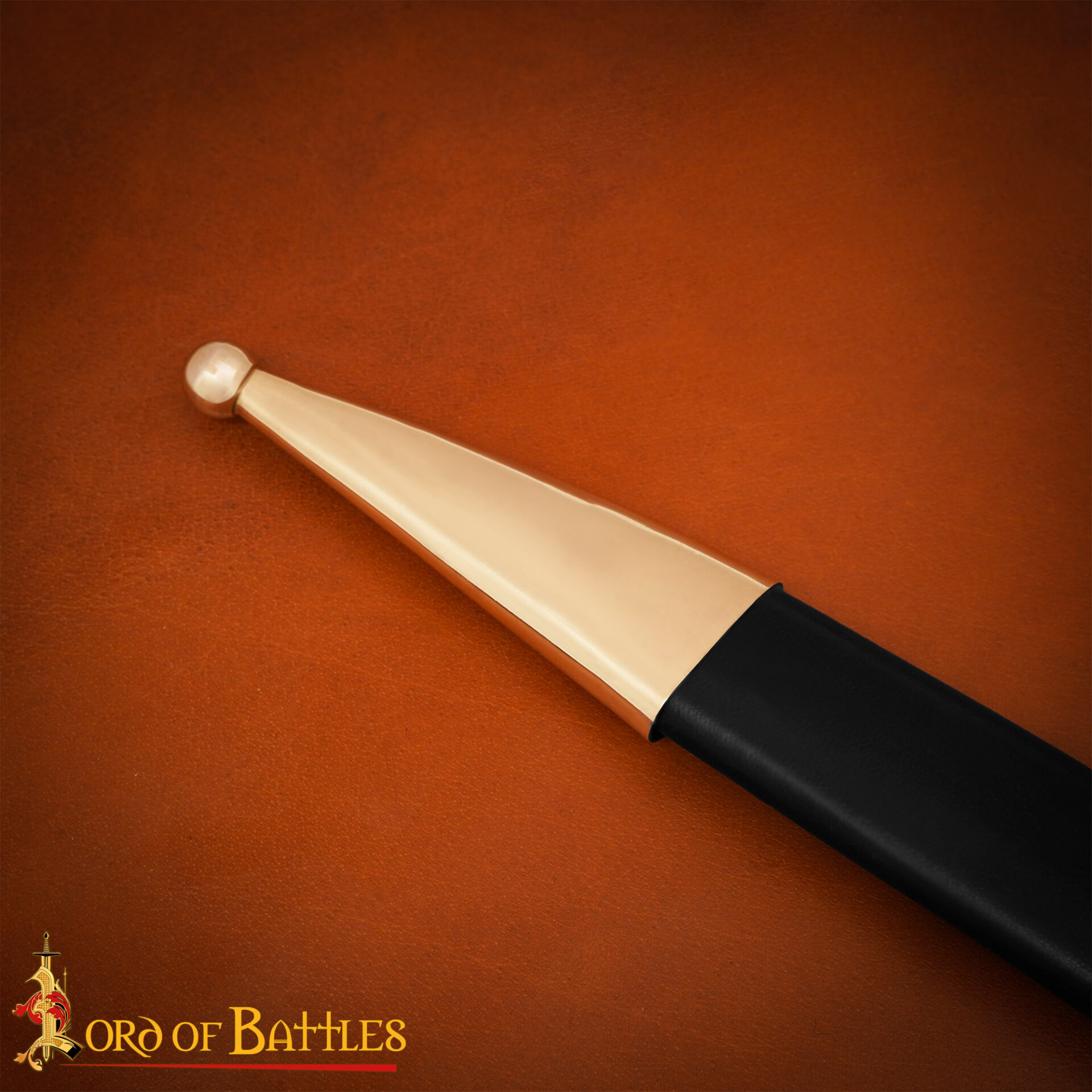 • Genuine leather scabbard, accented with antique-finish brass chape and fittings