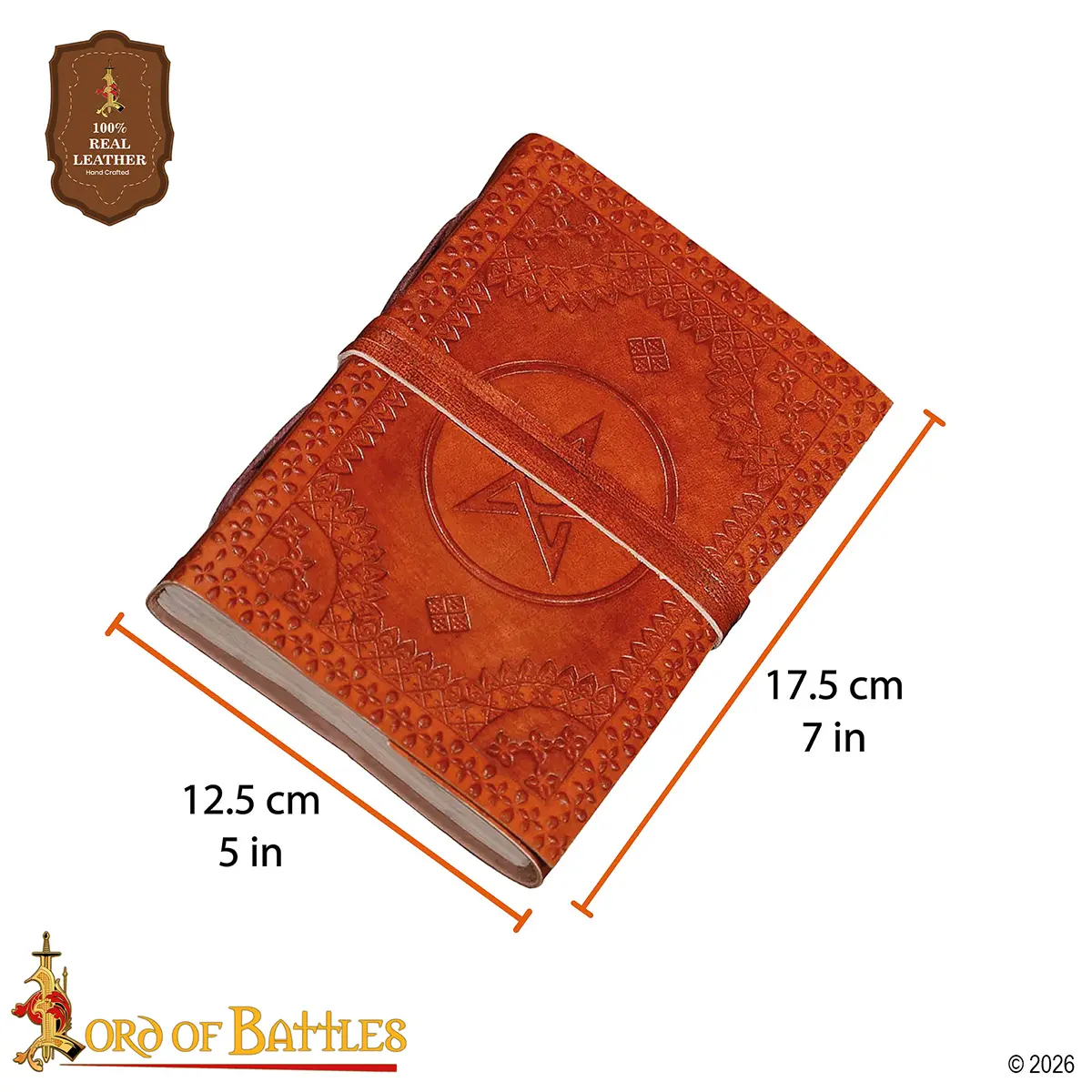 The Pentagram Medieval Leather Bound Journal is a handcrafted diary for writing,sketching, and personal thoughts. Measuring about 7 x 5 inches, it has a practical size that fits easily into a bag while still providing enough space for notes.