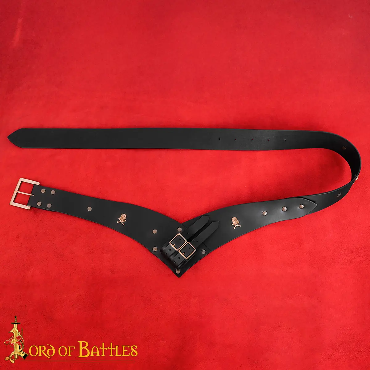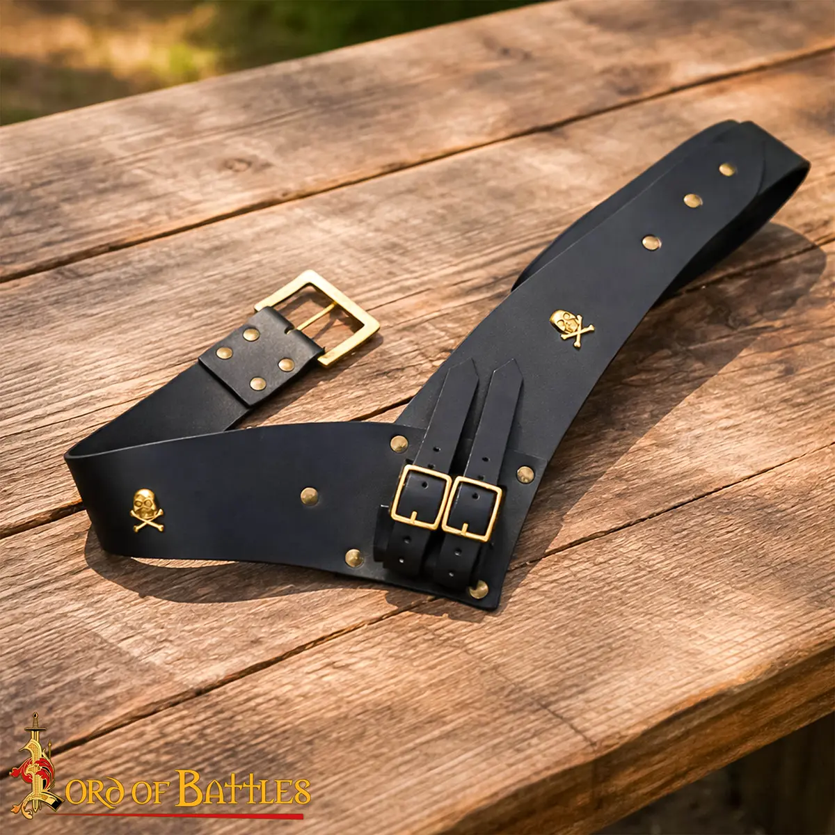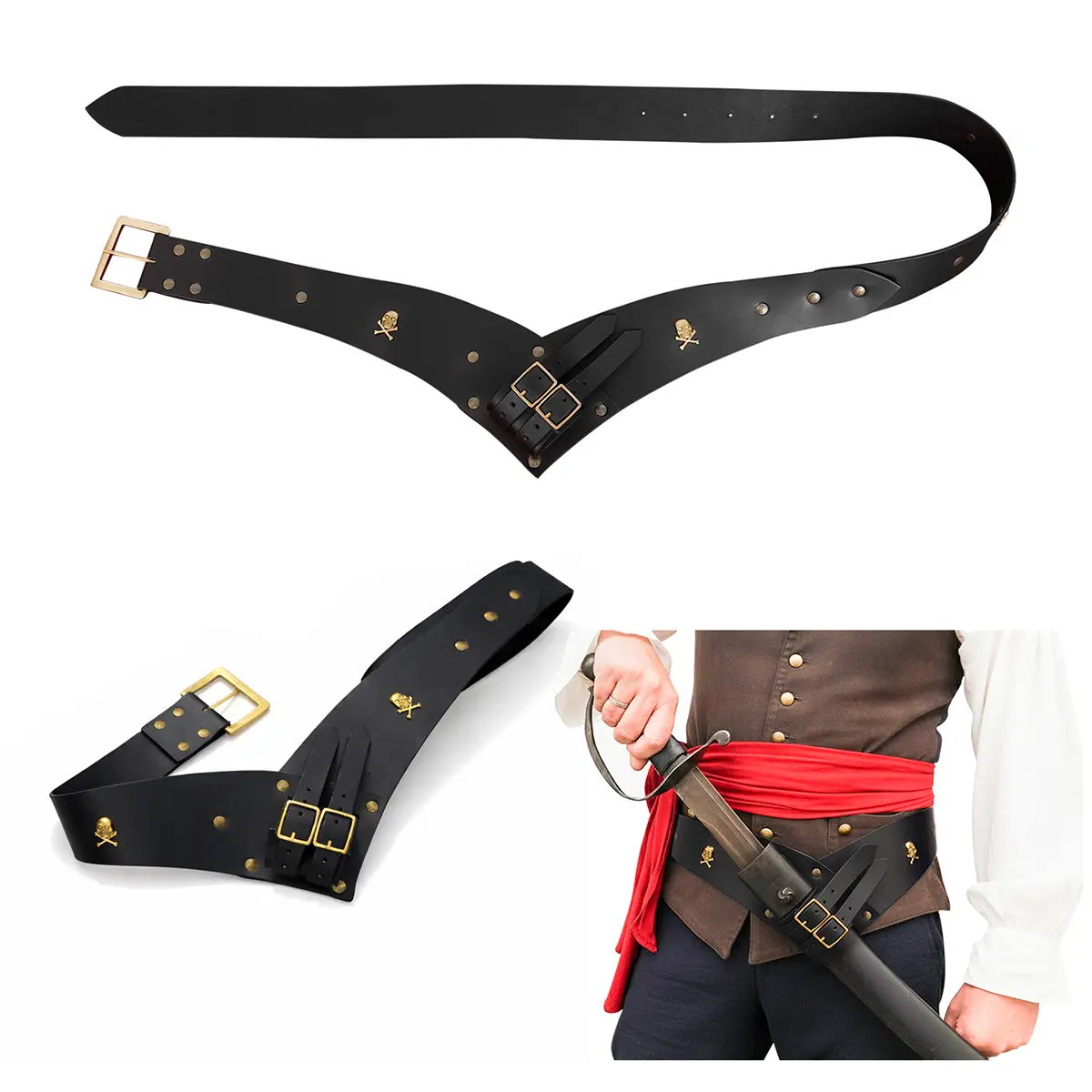 To add to its pirate charm, the belt is decorated with brass skull mounts, for a bold style and character. Every joint is reinforced with rivets, making it durable and resistant to damage, even with regular use.