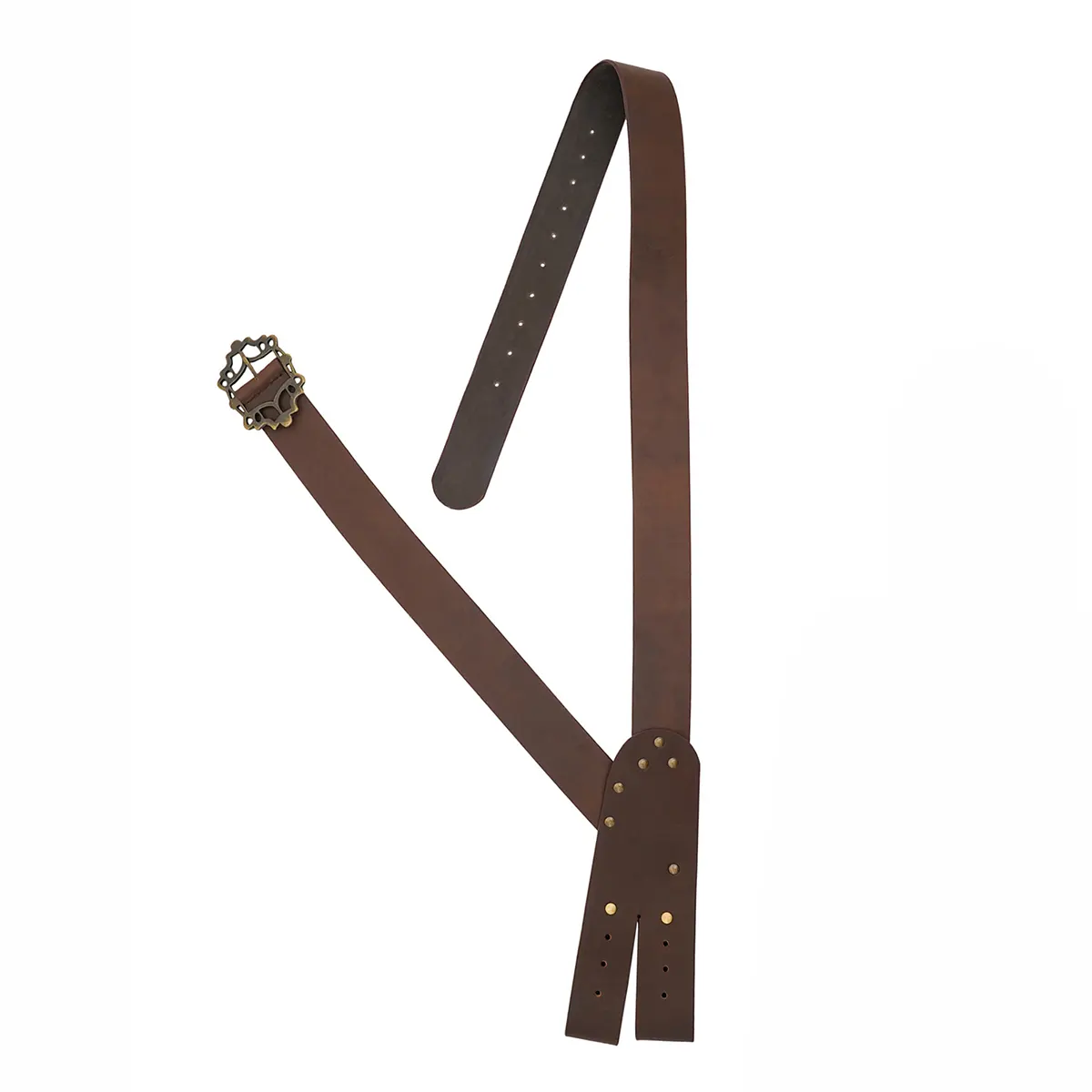 A key highlight of this leather pirate baldric is its fully adjustable sword-hanging loops. These loops are designed to accommodate swords of different blade widths, for a secure and comfortable fit. The elegant drape across the torso allows your sword to hang beautifully and functionally during performance.