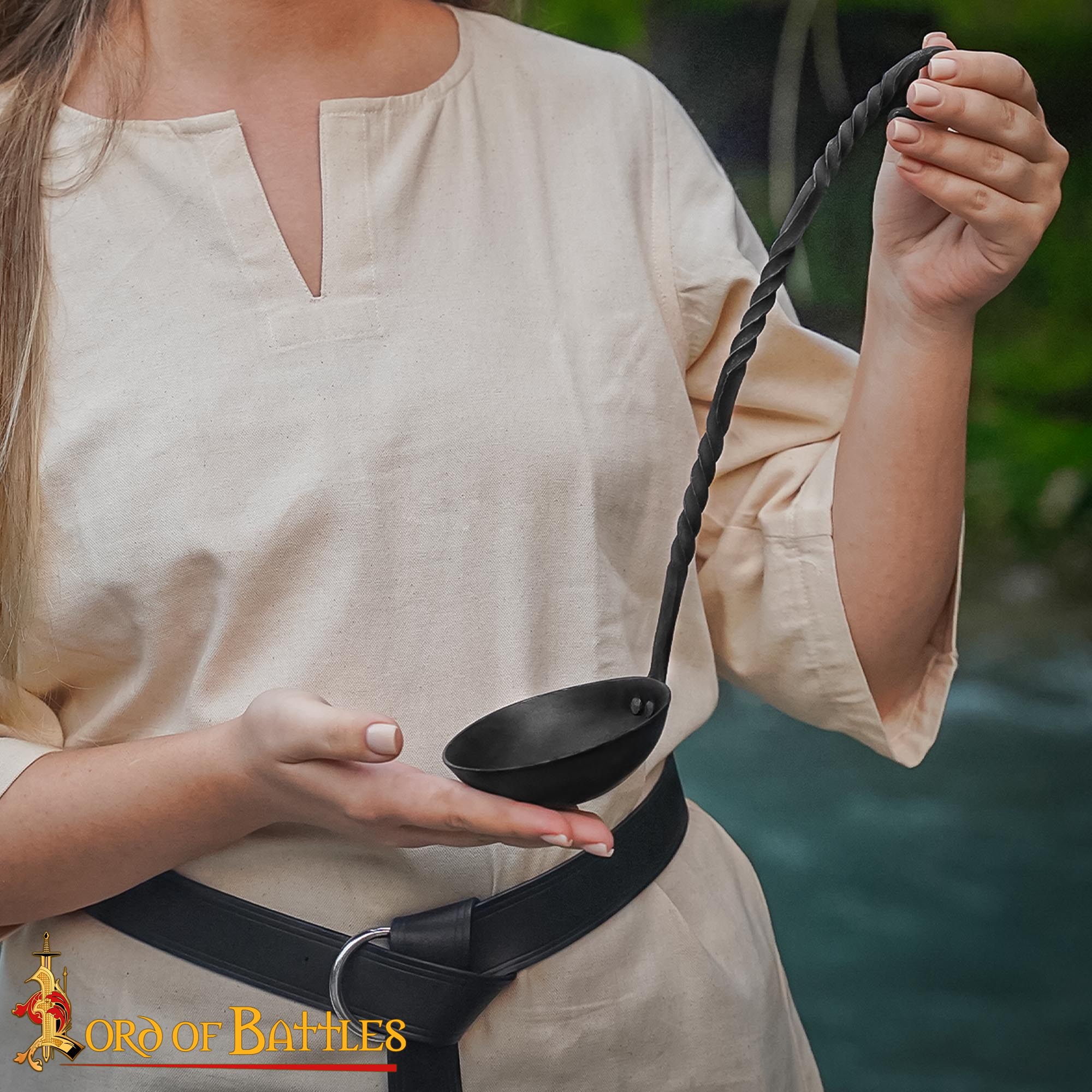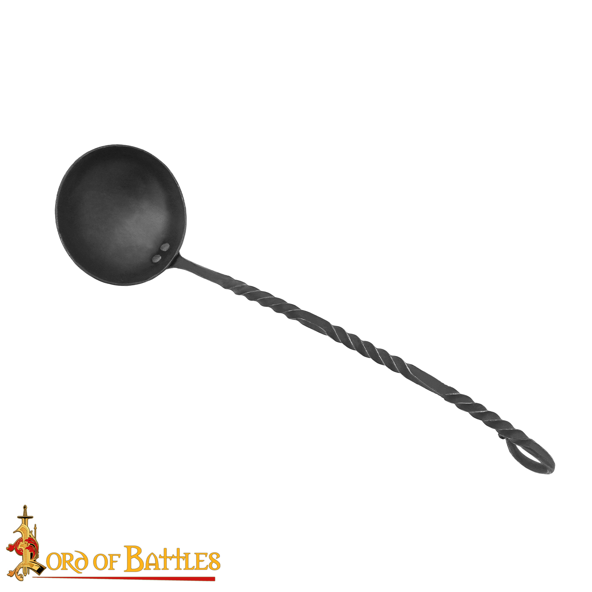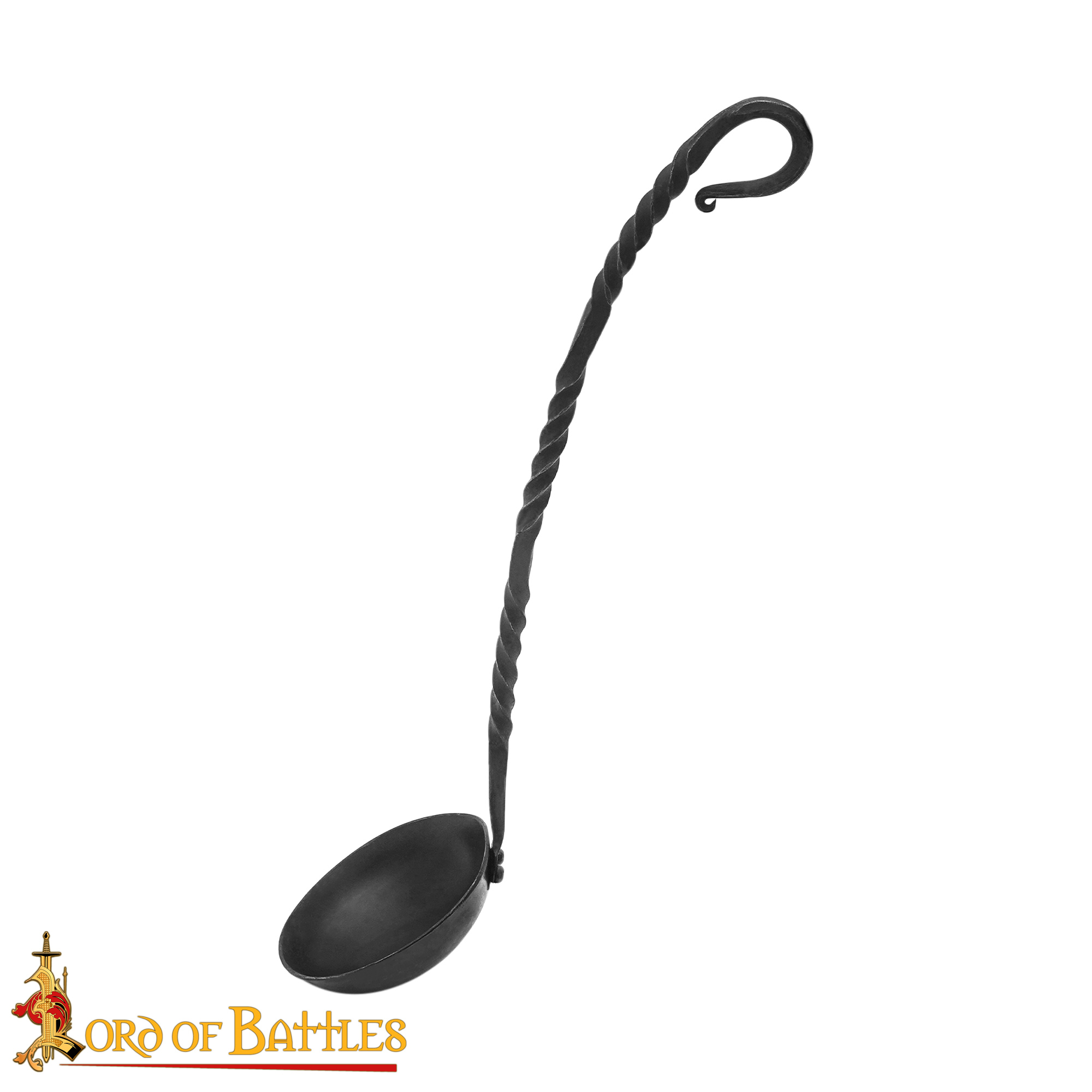 Crafted with meticulous care, this ladle features a long twisted handle that not only enhances its visual appeal but also provides an ergonomic grip for effortless serving. Its total length of 35 cm makes it perfectly suited for reaching deep into your fire-top cookware, ensuring that every last bit of your well-cooked pottage stew is served to perfection. Imagine gathering around the campfire with friends or family, the enchanting aroma of your hearty meal wafting through the air, as you serve it up with pride using this stunning ladle.