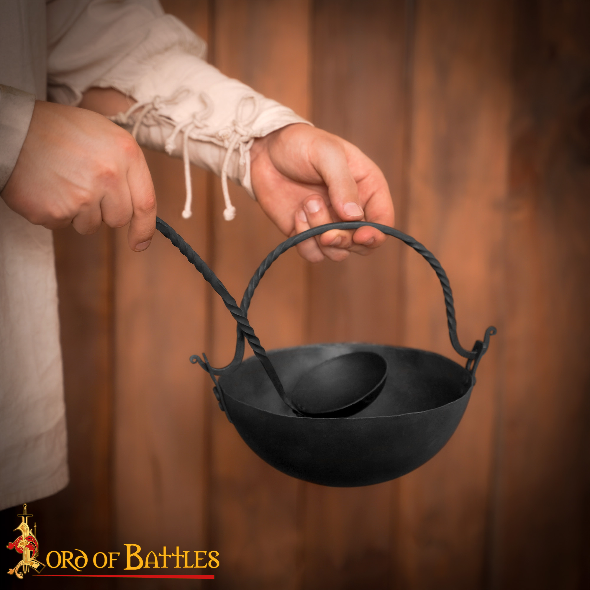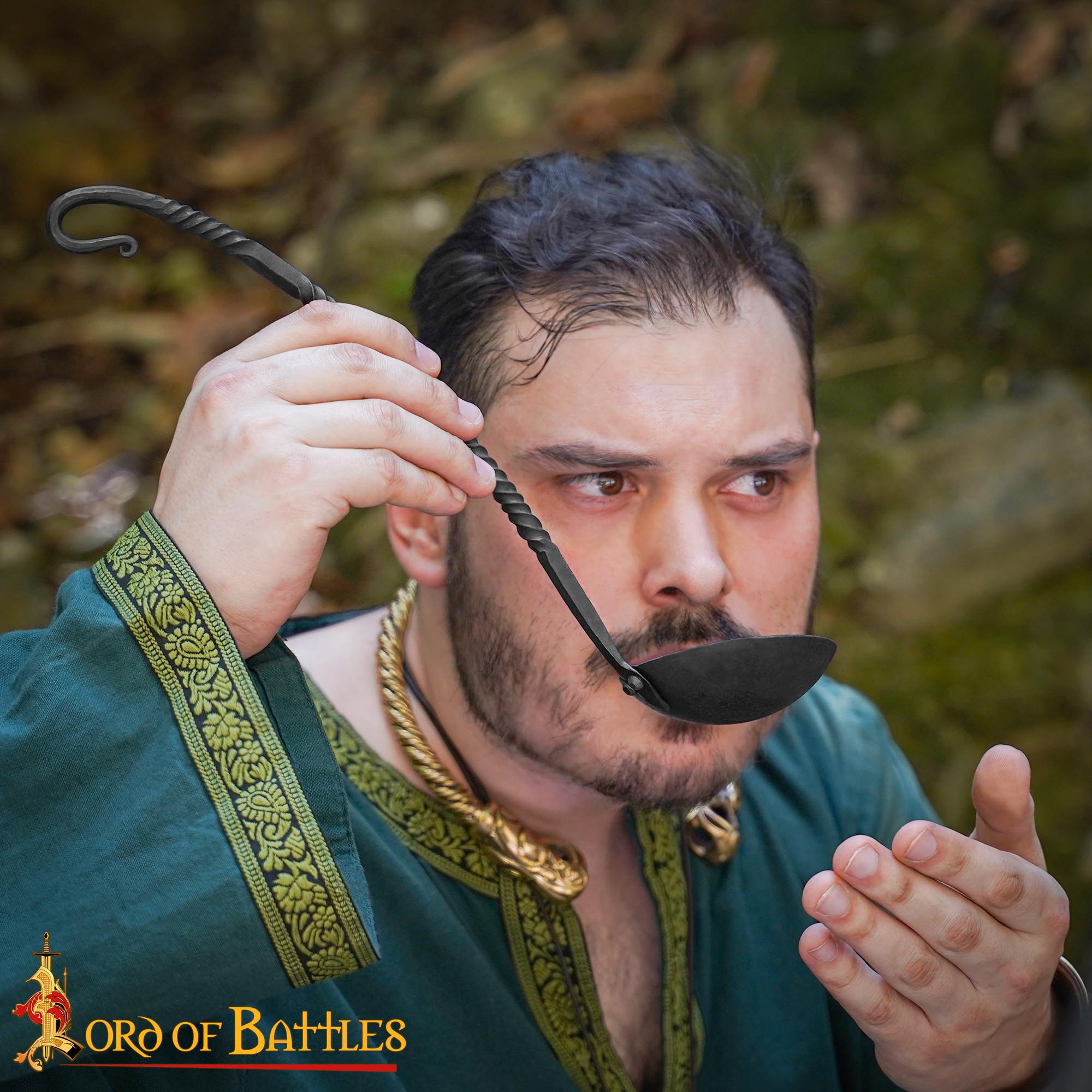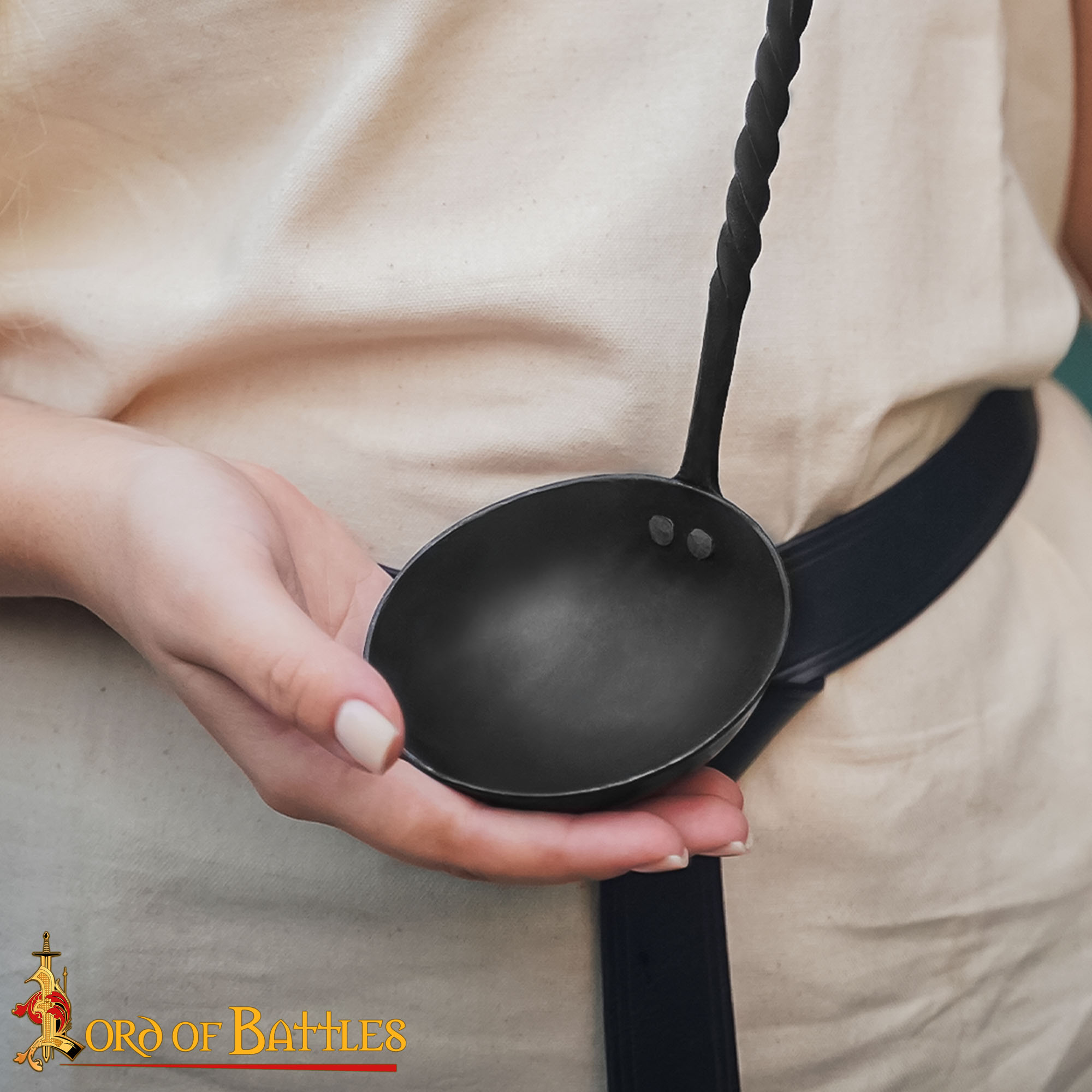 Crafted with meticulous care, this ladle features a long twisted handle that not only enhances its visual appeal but also provides an ergonomic grip for effortless serving. Its total length of 35 cm makes it perfectly suited for reaching deep into your fire-top cookware, ensuring that every last bit of your well-cooked pottage stew is served to perfection. Imagine gathering around the campfire with friends or family, the enchanting aroma of your hearty meal wafting through the air, as you serve it up with pride using this stunning ladle.