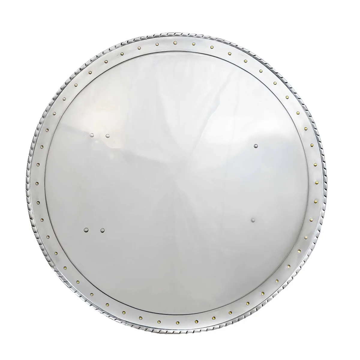 Hand-Forged 16 Gauge Steel Circular Shield with Brass Rivets: This Rodela shield is a recreation of historical Southern European defenses. Made from durable 16-gauge steel with polished front and blackened back, it is resilient, visually appealing, and historically authentic. The shield has a twisted steel edge for strength and medieval aesthetic, along with brass accents like craftsmanship found in Spanish and Italian designs.