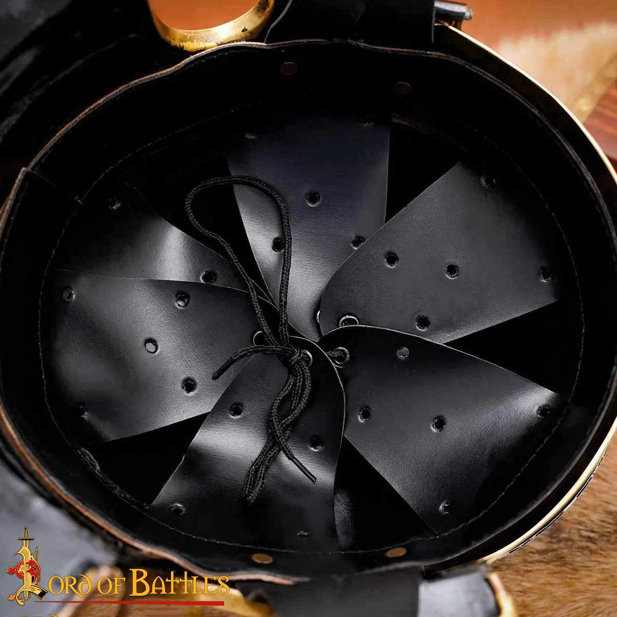 Crafted with meticulous care, this HANDMADE helmet is made from robust 18-gauge mild steel, ensuring durability while keeping a lightweight profile. The helmet features a comfortable faux leather liner that allows for hours of wear without discomfort, making it perfect for reenactments or cosplay events. With an approximate head circumference of 68 cm, it is designed to fit most head sizes securely, providing an authentic feel without compromising comfort.