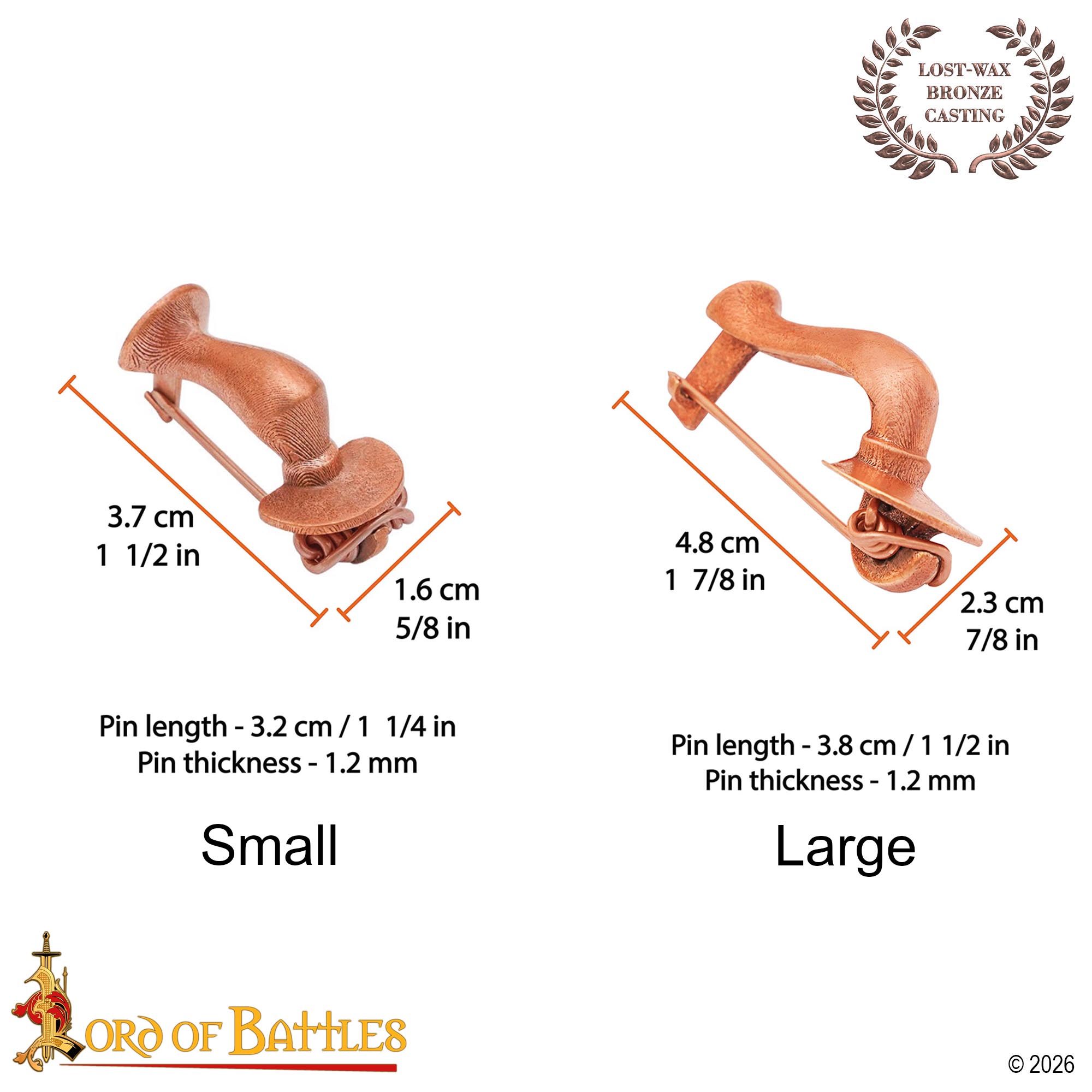This brooch is made from the lost wax casting method from pure bronze. This was a technique used by Roman workers. A wax model is shaped first, then put in a mold. The wax is melted away and replaced with molten bronze, this helps in getting fine details and giving each piece its own character, this method helps in producing a properly detailed bronze brooch.