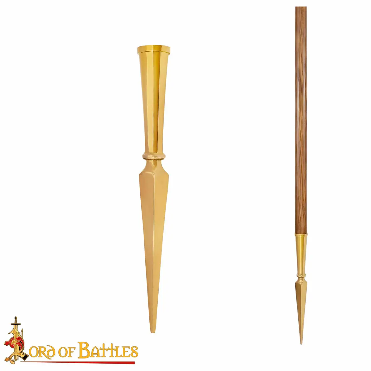 This Roman Spearhead is crafted from solid brass and polished to a rich golden finish. It has a classic conical shape with a symmetrical blade and a long, tapering point designed for deep penetration. The socketed base allows it to be mounted onto a wooden shaft like ancient times.