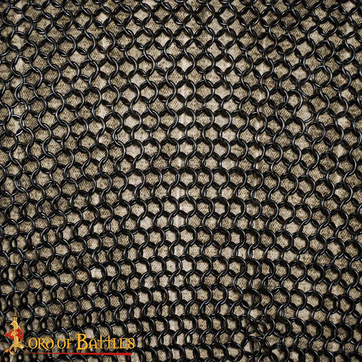 Each shirt is hand-assembled from butted mild steel rings, crafted in 16 gauge thickness and 10 mm diameter. The rings interlock to create a dense, strong weave that looks just like the armor worn by knights and soldiers centuries ago. While riveted mail is the strongest historical style, this butted version is an excellent affordable alternative, giving enthusiasts, LARP players, and costumers the authentic look without the heavier price tag.