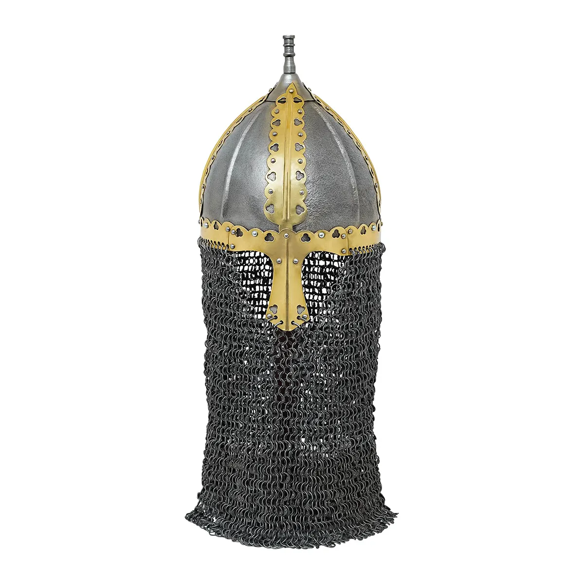 One of the standout features of this helmet is its extra-long riveted mail aventail, extending down to your chest for unparalleled protection during your courageous escapades. Measuring 14 inches in total and an impressive 11 inches from the tip of the nasal plate, this rail provides essential coverage against incoming strikes, allowing you to focus on your adventure rather than your safety.