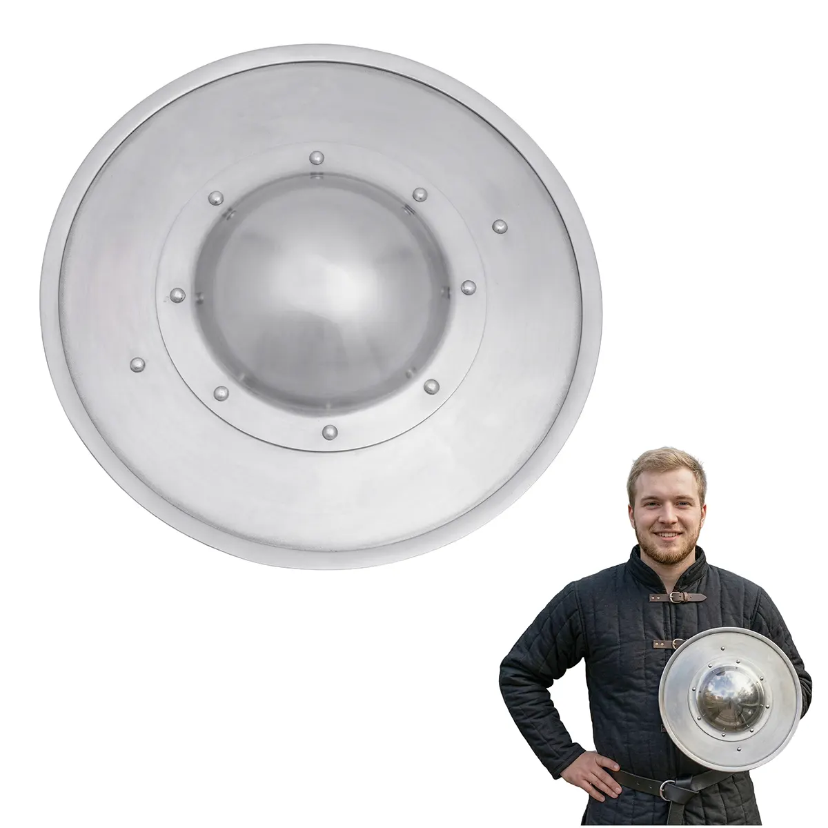 At the center, the riveted domed boss protects the hand as well as brings offensive potential, ideal for deflecting strikes, binding blades, or punching during fast exchanges. The flared rim increases strength and stability, supporting advanced techniques practiced in historical fencing.