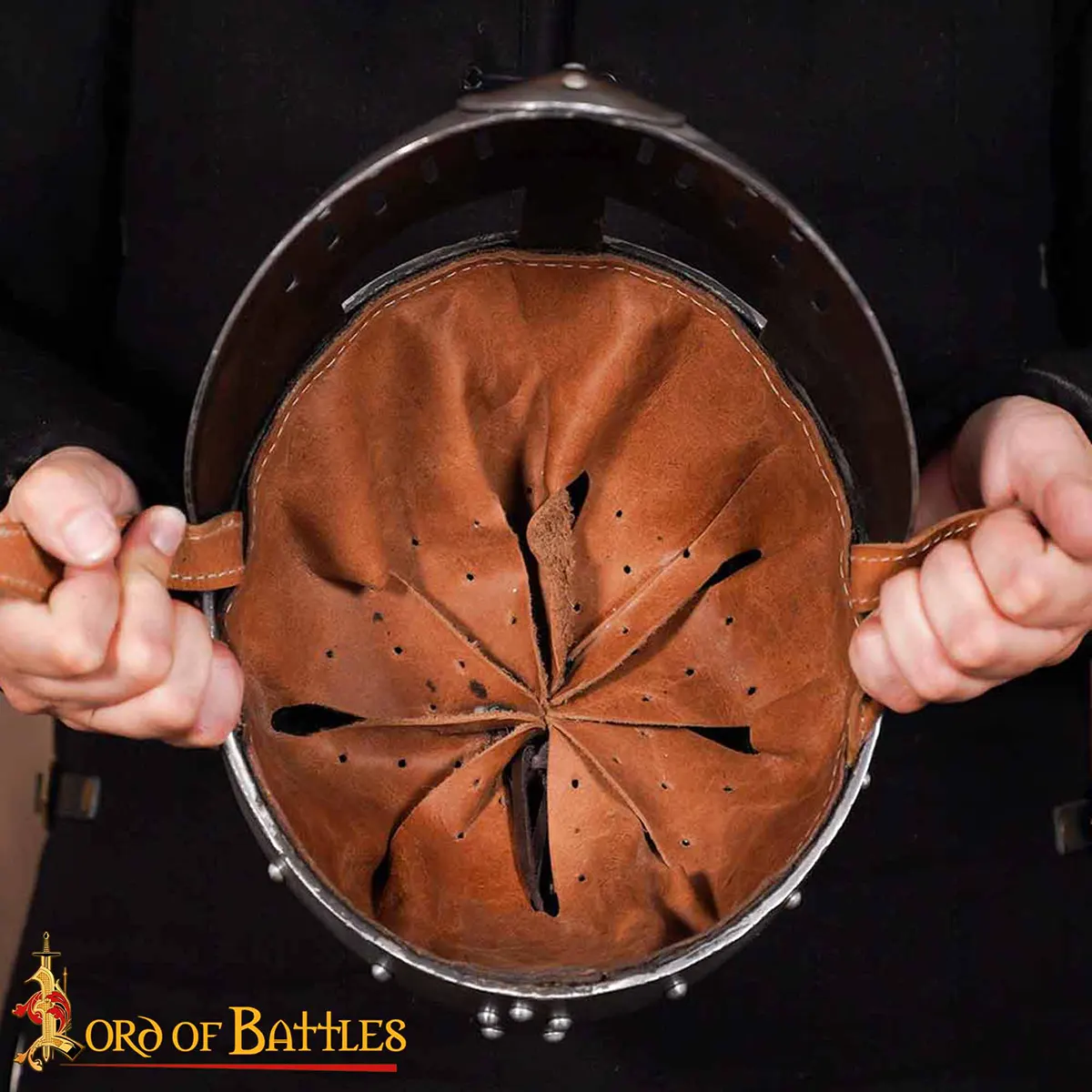 Made from 16-gauge mild steel, the helmet provides solid protection without being too heavy. Inside, a stitched leather suspension liner cushions the head and spreads weight evenly for comfort. A leather chin strap with buckle keeps the helmet secure whether worn in combat or displayed as a collector’s piece.