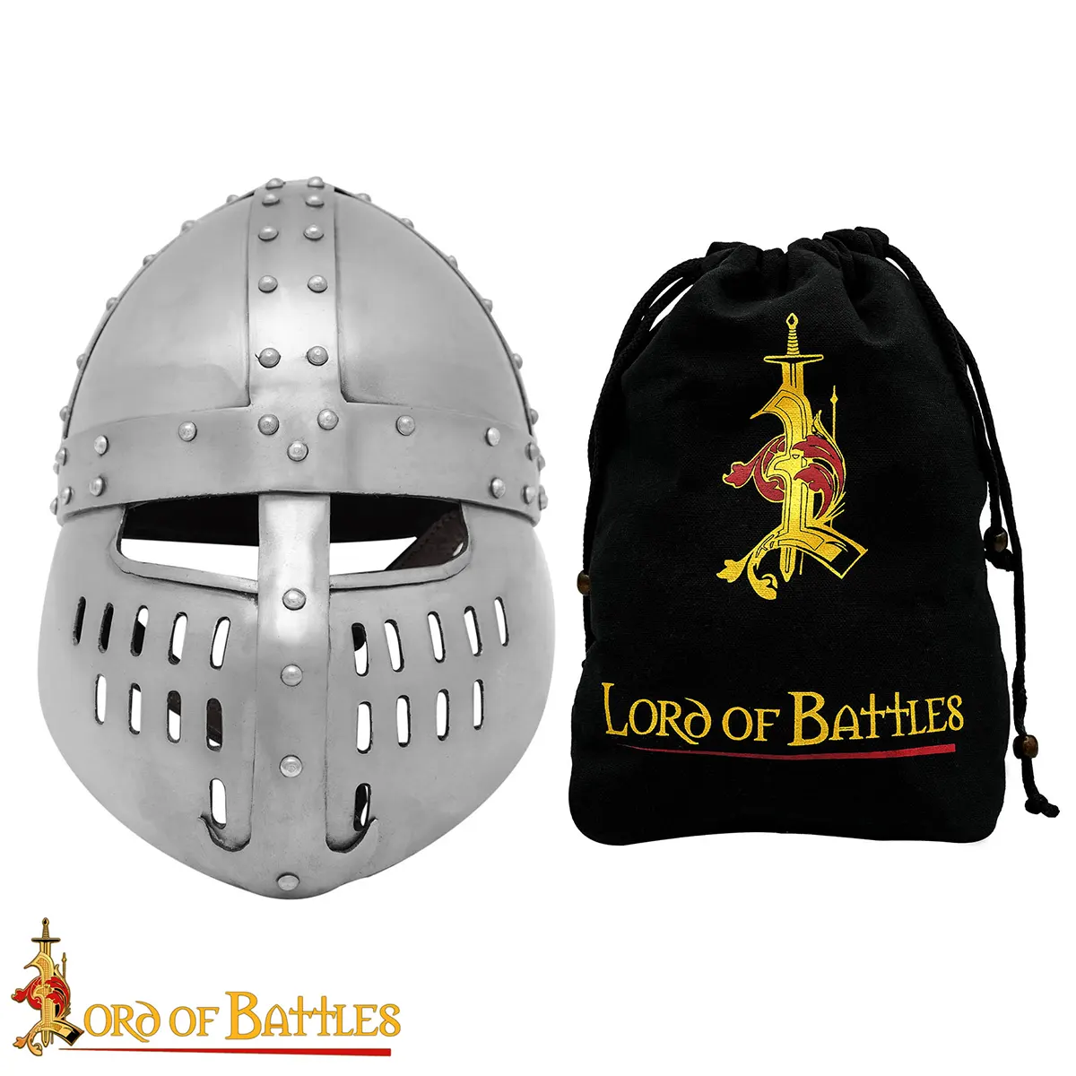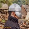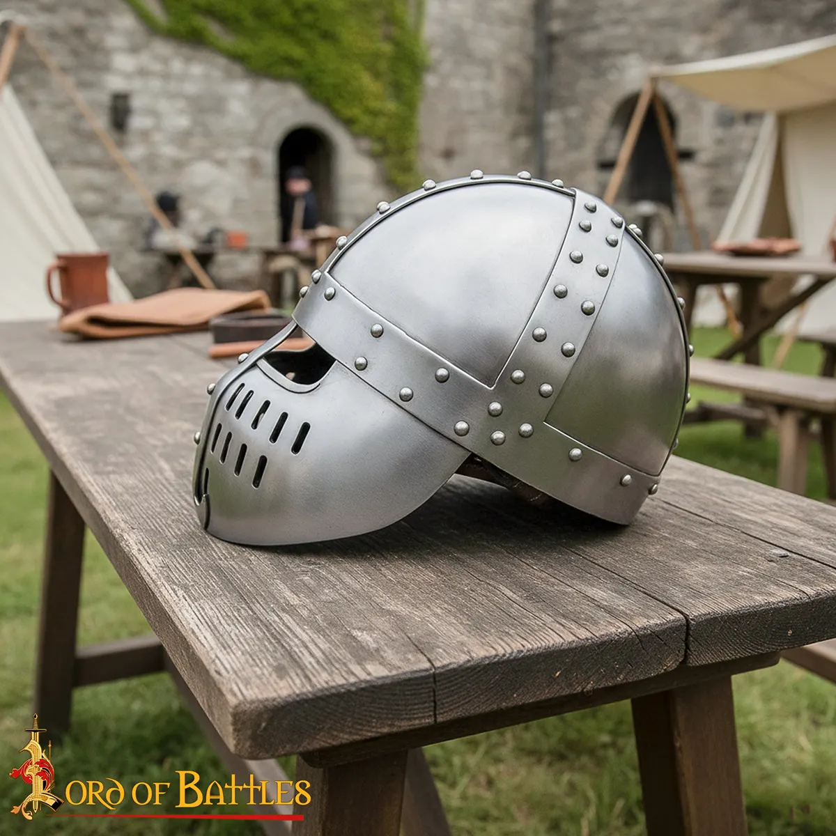 The helmet is built with a segmented steel dome, fixed by riveted bands for durability and authenticity. Its face plate protects the lower face while still allowing good visibility and airflow, ideal for reenactments, training, or roleplay. The overlapping design adds extra defense against blows and projectiles.