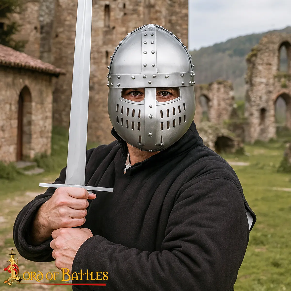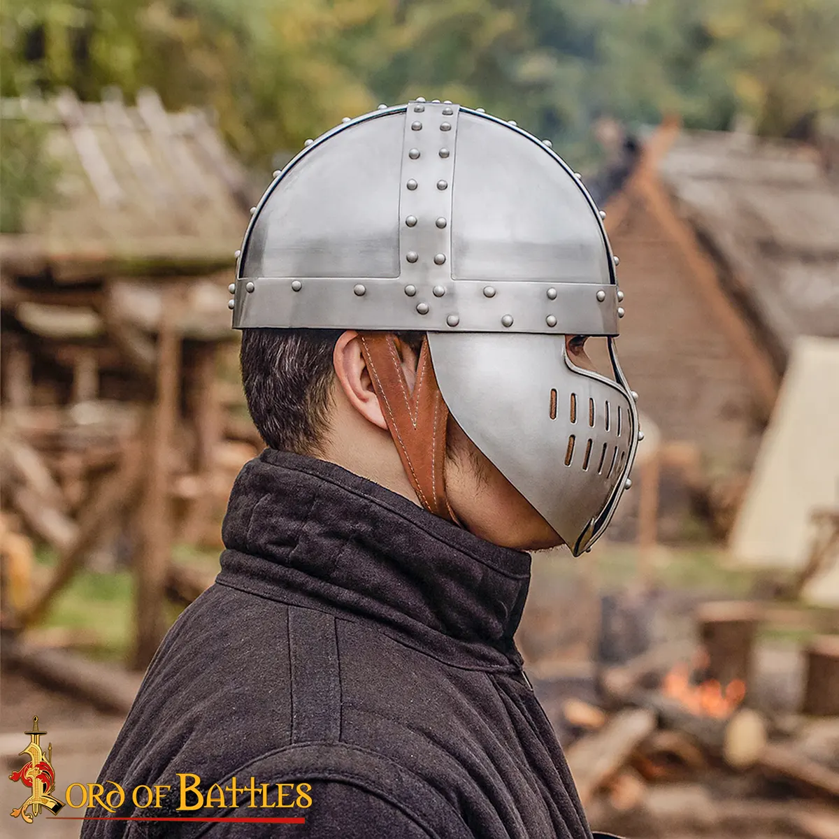 Step into the role of a Norman warrior with our Spangenhelm Helmet with Face Plate—a faithful reproduction of one of the most iconic helmets of the early Middle Ages. Known for its riveted framework (Spangen) and fitted face guard, this style was favored by Normans, Vikings, and Crusaders for its strength, practicality, and layered protection.