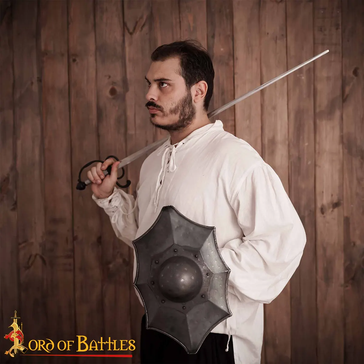 Medieval Talhoffer Shield, 15th-Century Fechtbuch Design: This Talhoffer Buckler is a true reproduction inspired by the famous Talhoffer Fechtbuch (Fencing Book) of the 15th century. Named after the fencing master Hans Talhoffer, this buckler shield displays the techniques, proportions, and aesthetics of historical European martial arts. Ideal for collectors and HEMA practitioners who want an accurate shield and buckler set-style companion.
