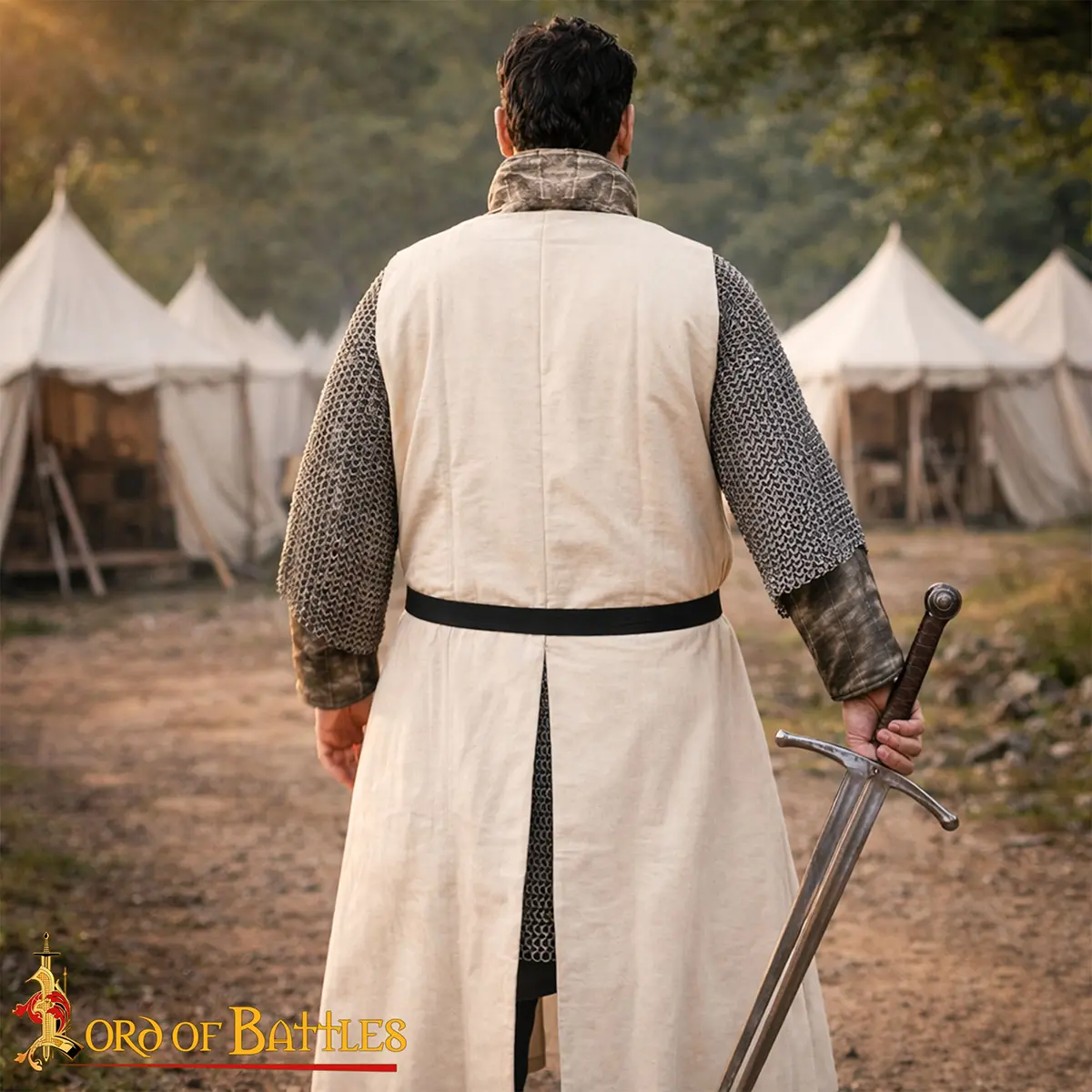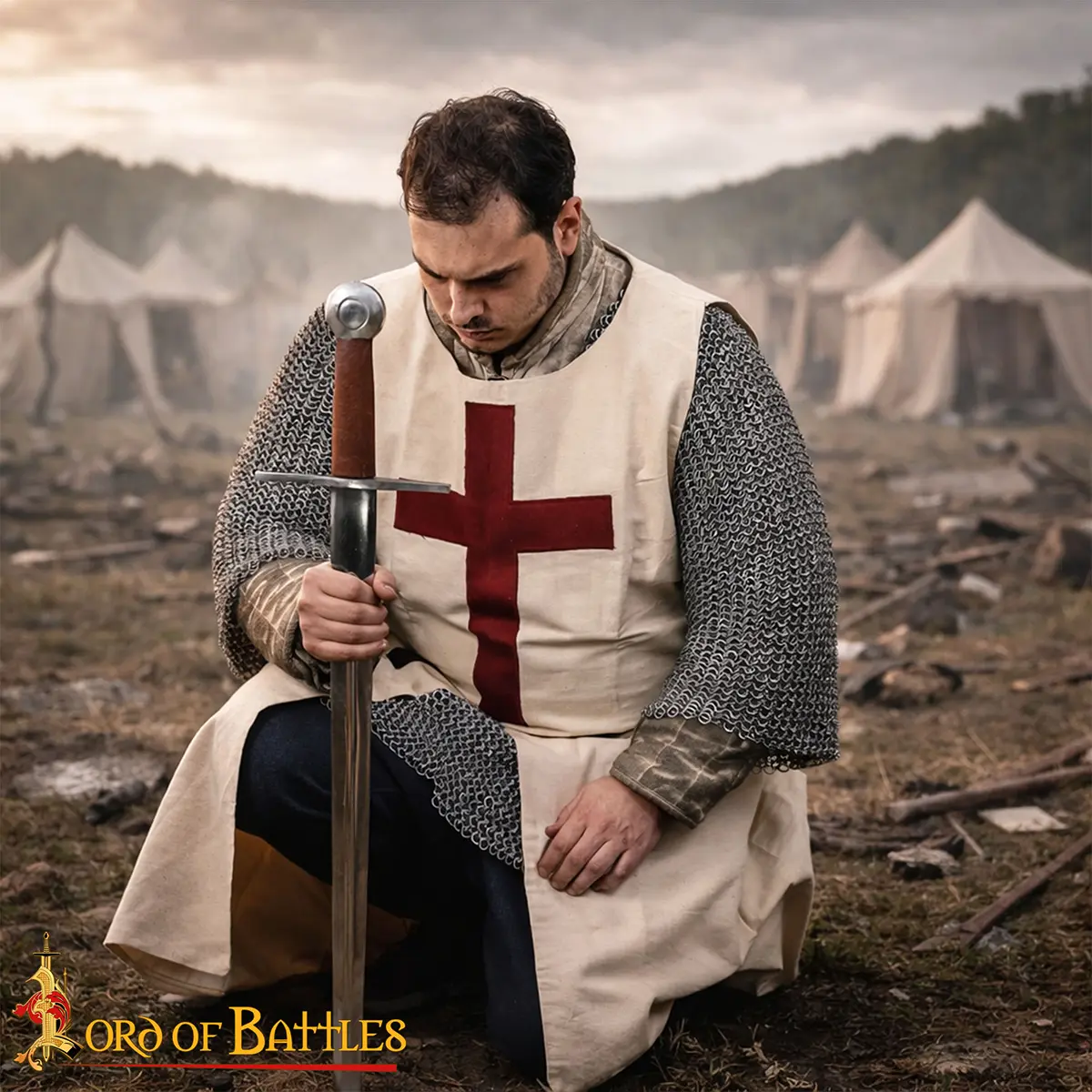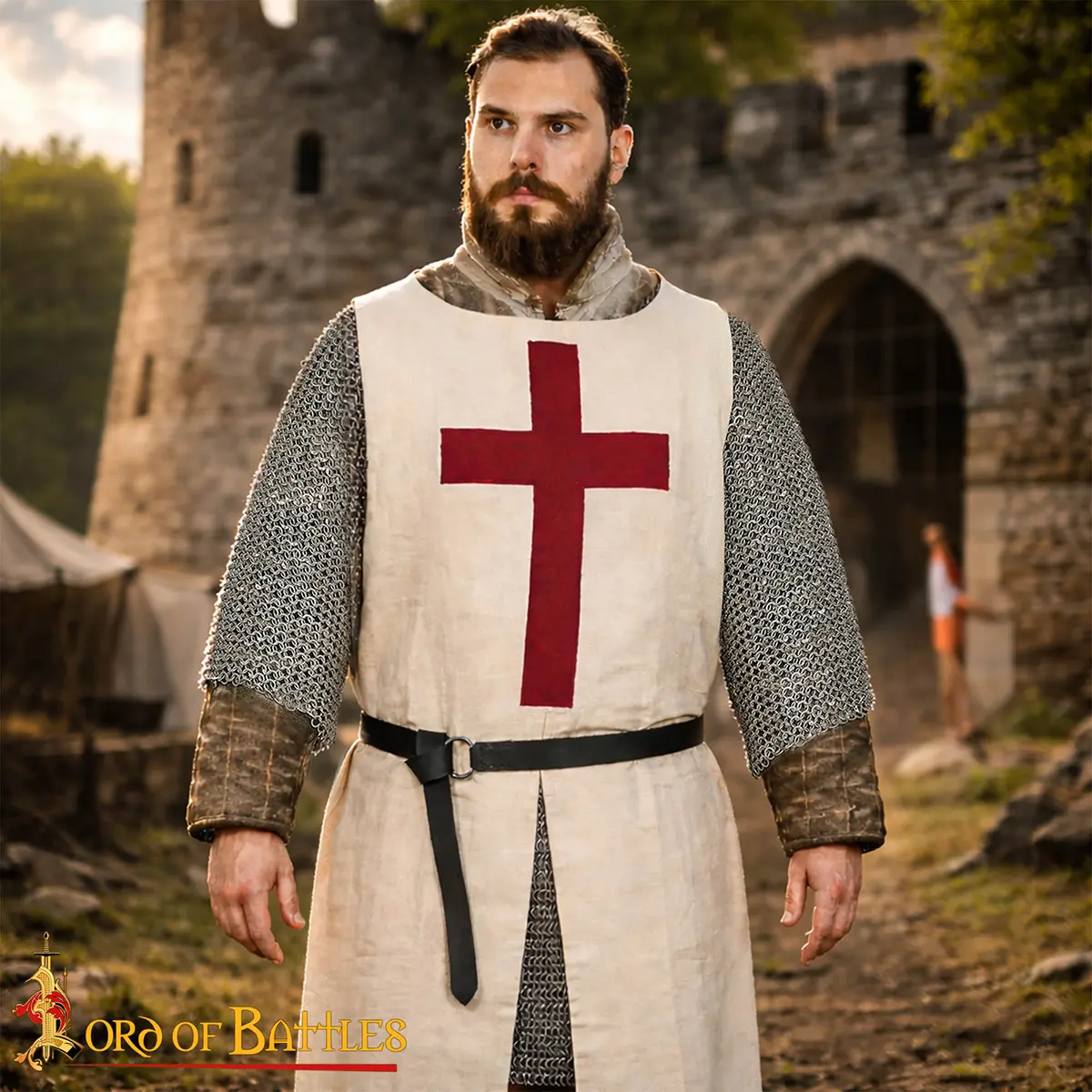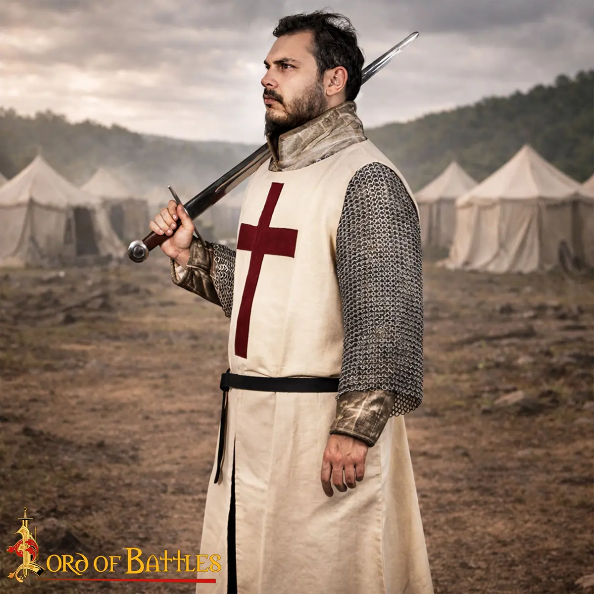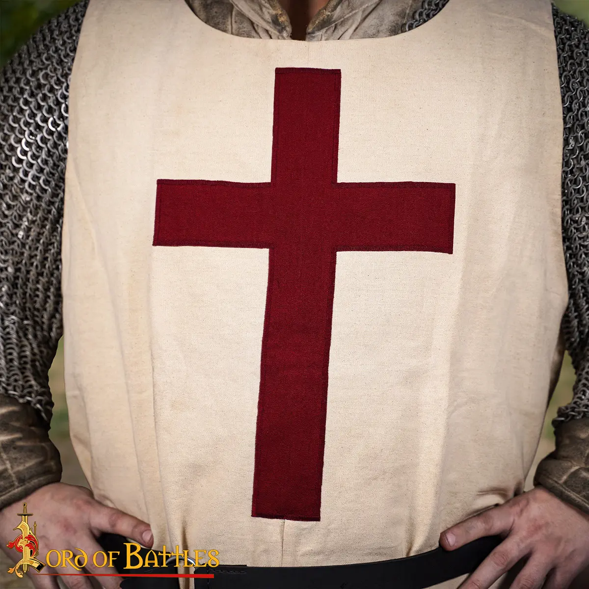 The centerpiece of this Medieval Crusader Surcoat is the bold red cross of the Knights Templar, a powerful symbol of faith, duty, and brotherhood. Like the Teutonic and Hospitaller orders, the Templars adopted their distinctive tabards in the 12th century, wearing them over chainmail or plate to shield from the sun and to identify allies on the battlefield.