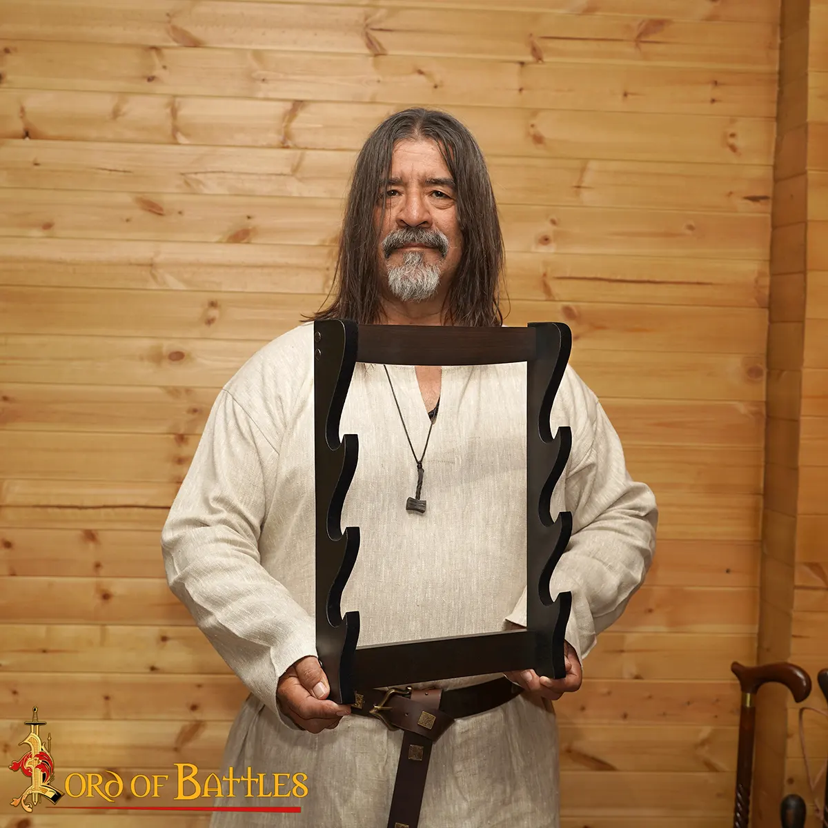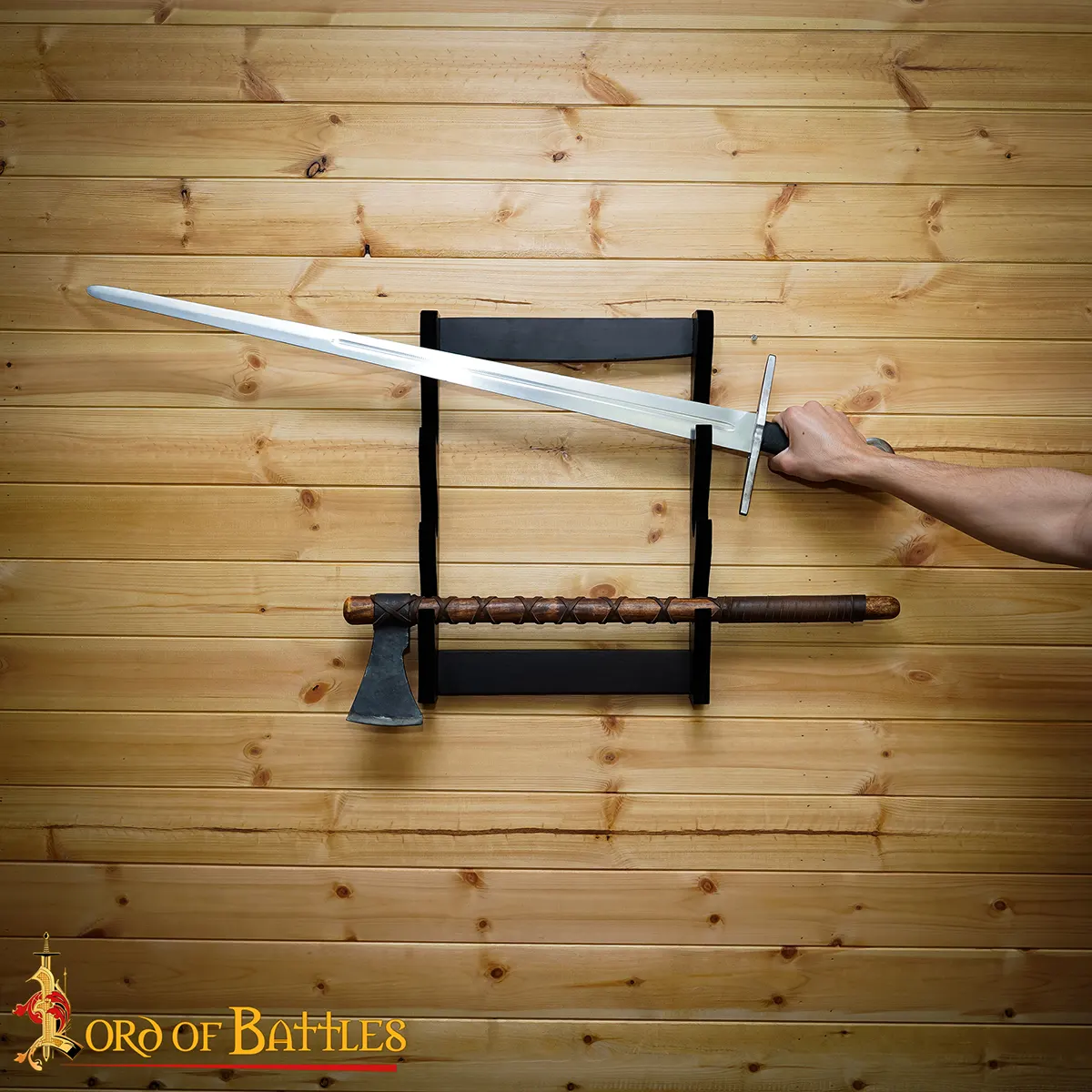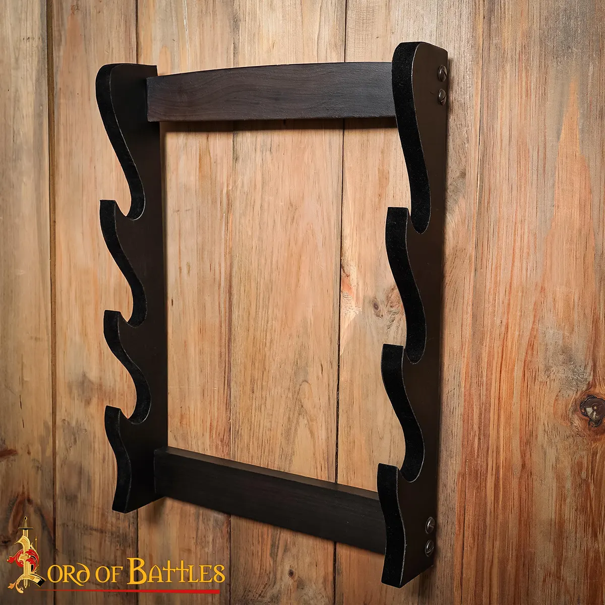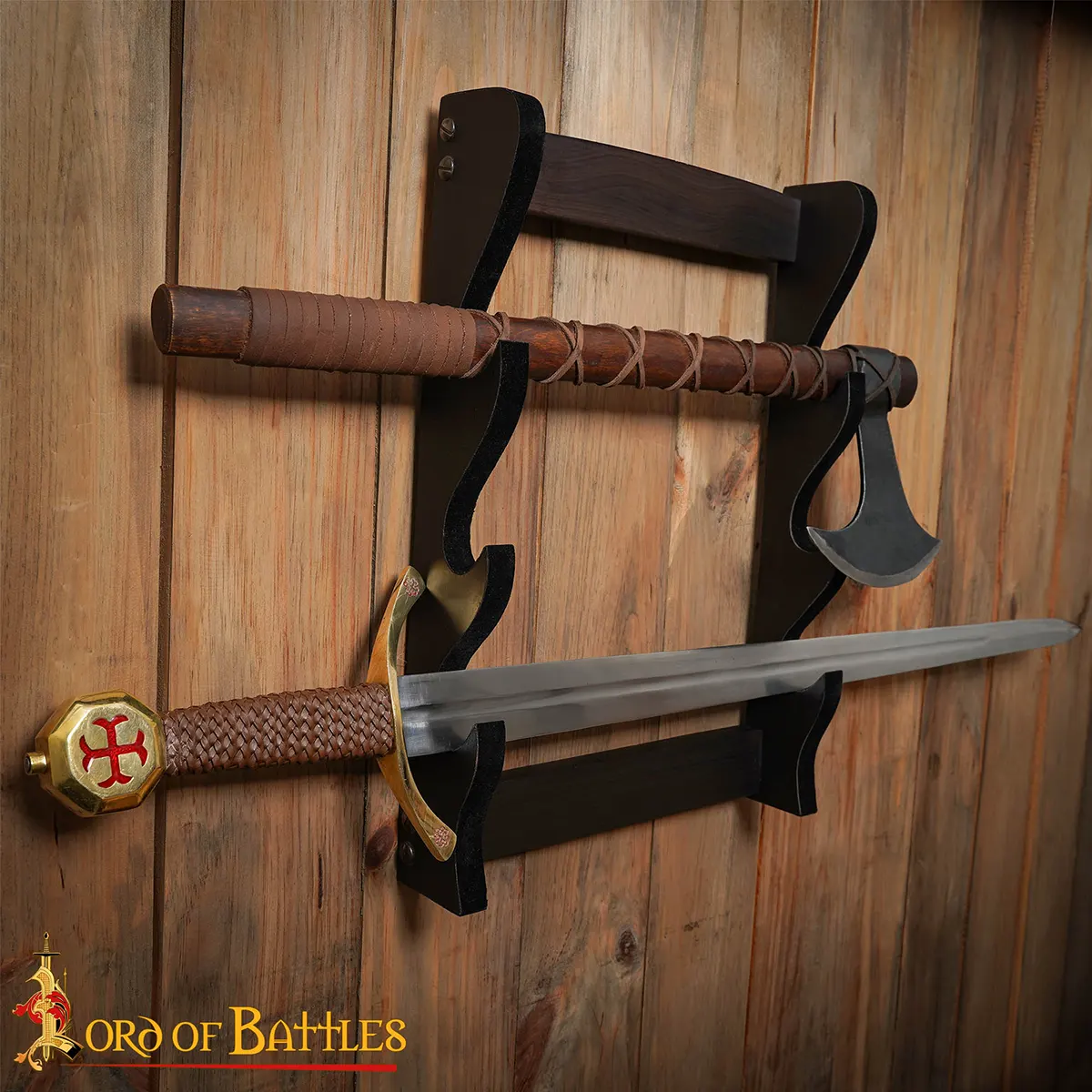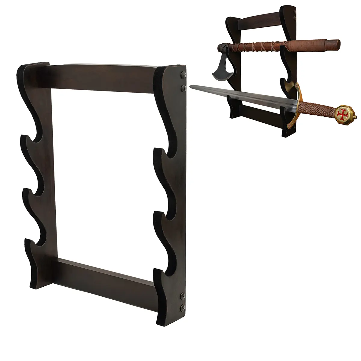 This is more than just a display stand; it serves as a statement piece in your home or office. Adorned with a classic, deep wooden texture, it complements both contemporary decors and medieval aesthetics alike. Imagine this regal stand gracing your wall, allowing your swords and axes to hold court in your personal space. Each glance at your showcased weapons will evoke stories of epic battles and legendary warriors, captivating the imagination of guests and igniting conversations among enthusiasts.