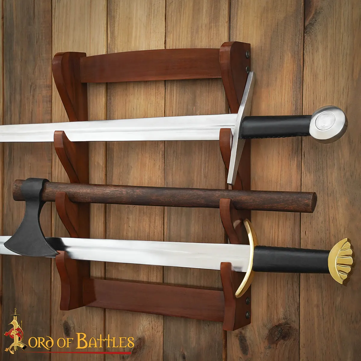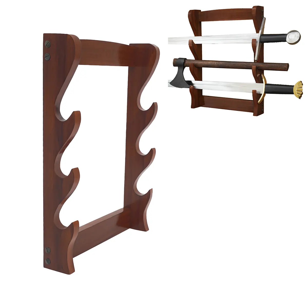 Immerse yourself in the art of display with our Three Tier Sword and Axe Stand, a magnificent piece that marries functionality with elegance. While preparing for your next quest or simply selecting your prized weapon, this handcrafted stand becomes a spectacle in your living space, showcasing your swords and axes like the masterpieces they are. Imagine walking by this exquisite display, each blade catching the light, reminding you of battles fought or adventures yet to come.