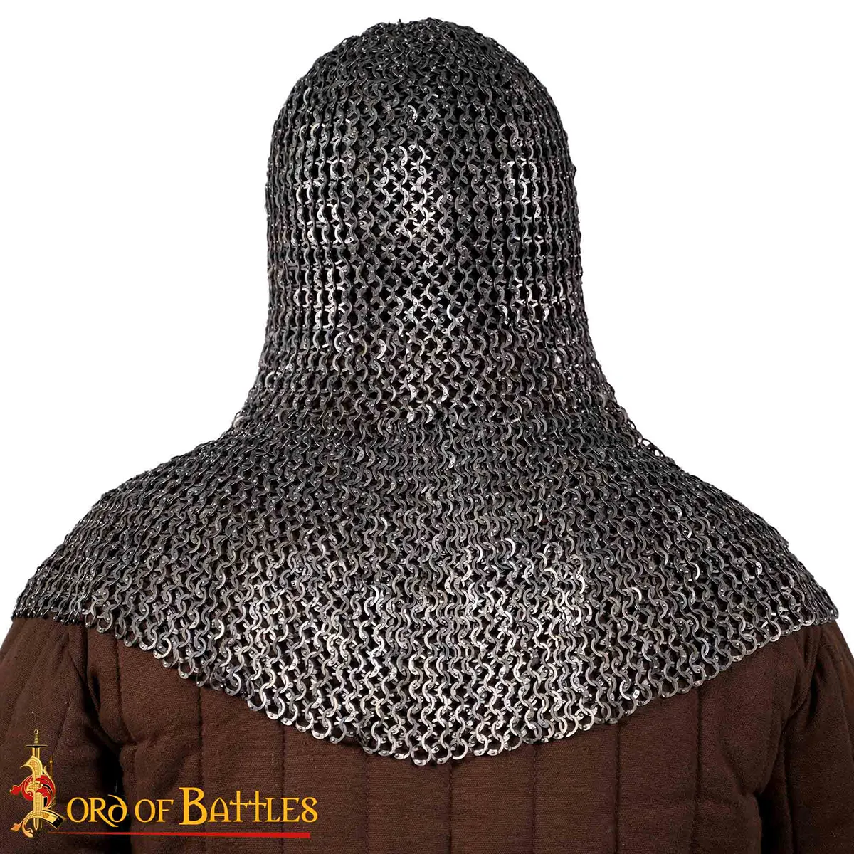 A: This coif chainmail uses riveted flat rings in a traditional 4-in-1 European weave for enhanced durability.