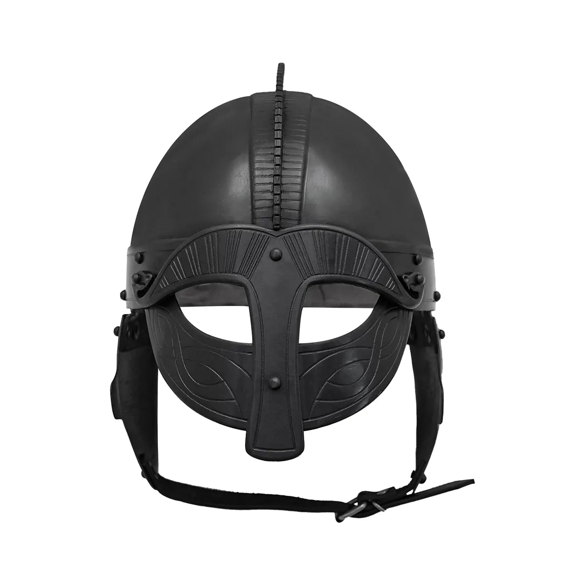 Expertly handcrafted from 16-gauge steel and finished with a protective blackened coating, this helm combines strength with historical style. Its distinctive spectacle-style mask guard protects the eyes and nose while preserving clear visibility, while the ridged brow and crest echo the fine detailing of original Vendel-era finds, making it both protective and visually commanding.