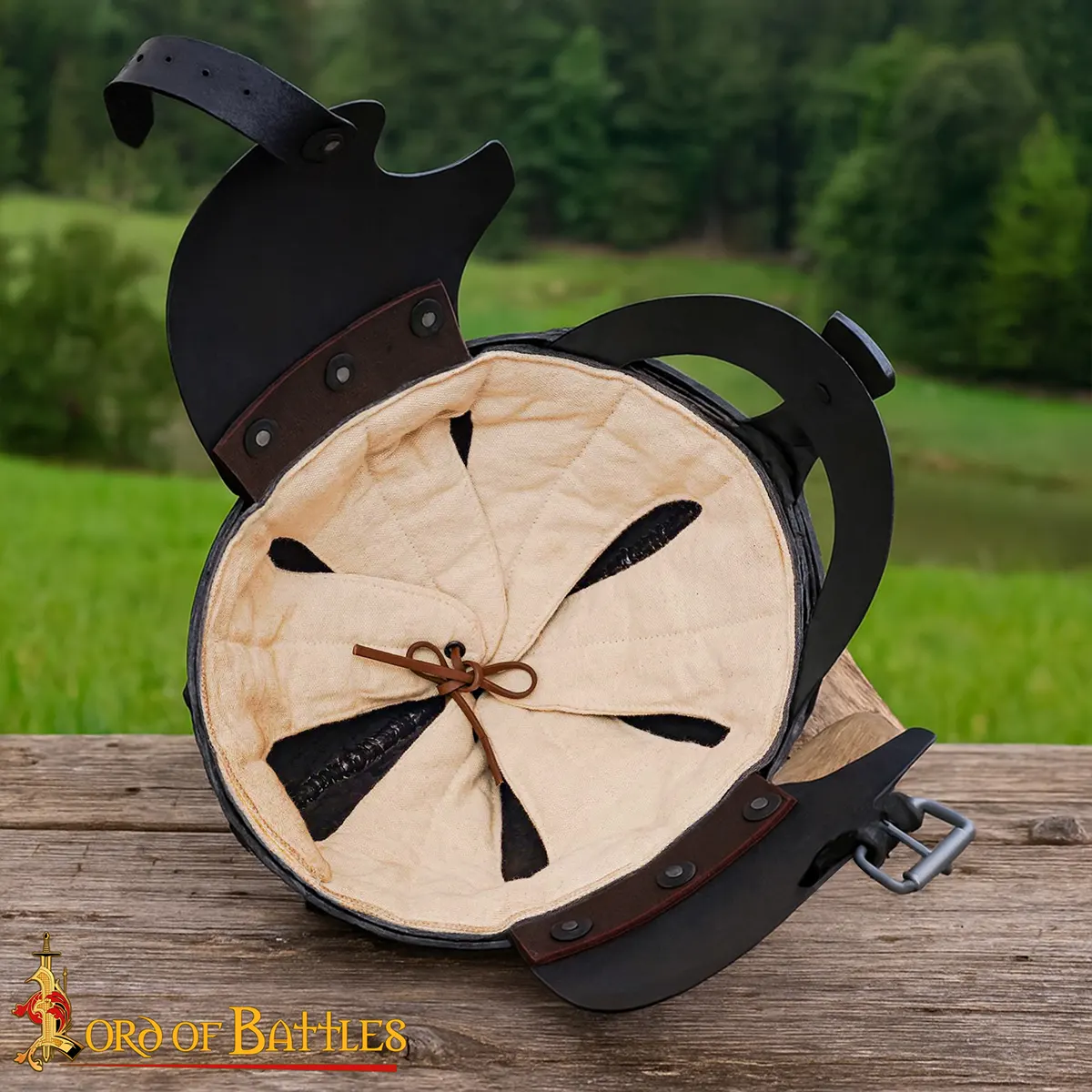 Inside, the steel helmet is fitted with a quilted padded liner that cushions the head and distributes weight evenly, ensuring comfort during extended wear. A leather cord keeps it securely in place, whether you are taking part in historical reenactments, Viking-age festivals, LARP battles, or showcasing it as a collector’s piece.