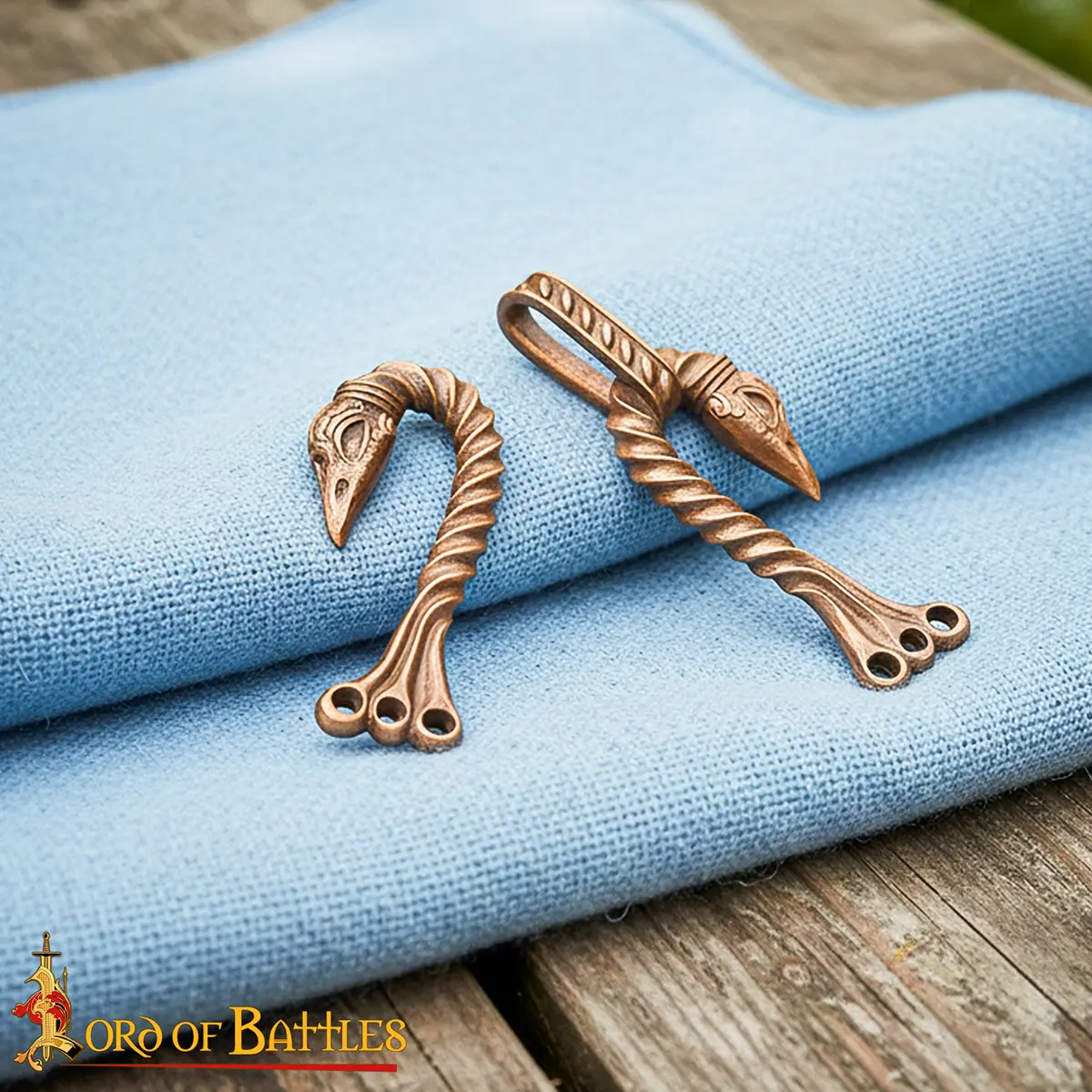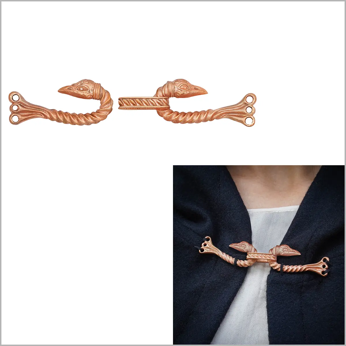 With a three-hole fastening system at each end, the clasp can be stitched firmly onto thick wool, linen, or other layered fabrics. This makes it suitable as a medieval cloak clasp, a bronze cloak clasp, or a functional clasp for cloak use in LARP or historical costume builds. Its construction also makes it very reliable to be used as a cloak clasp for repeated wear.
