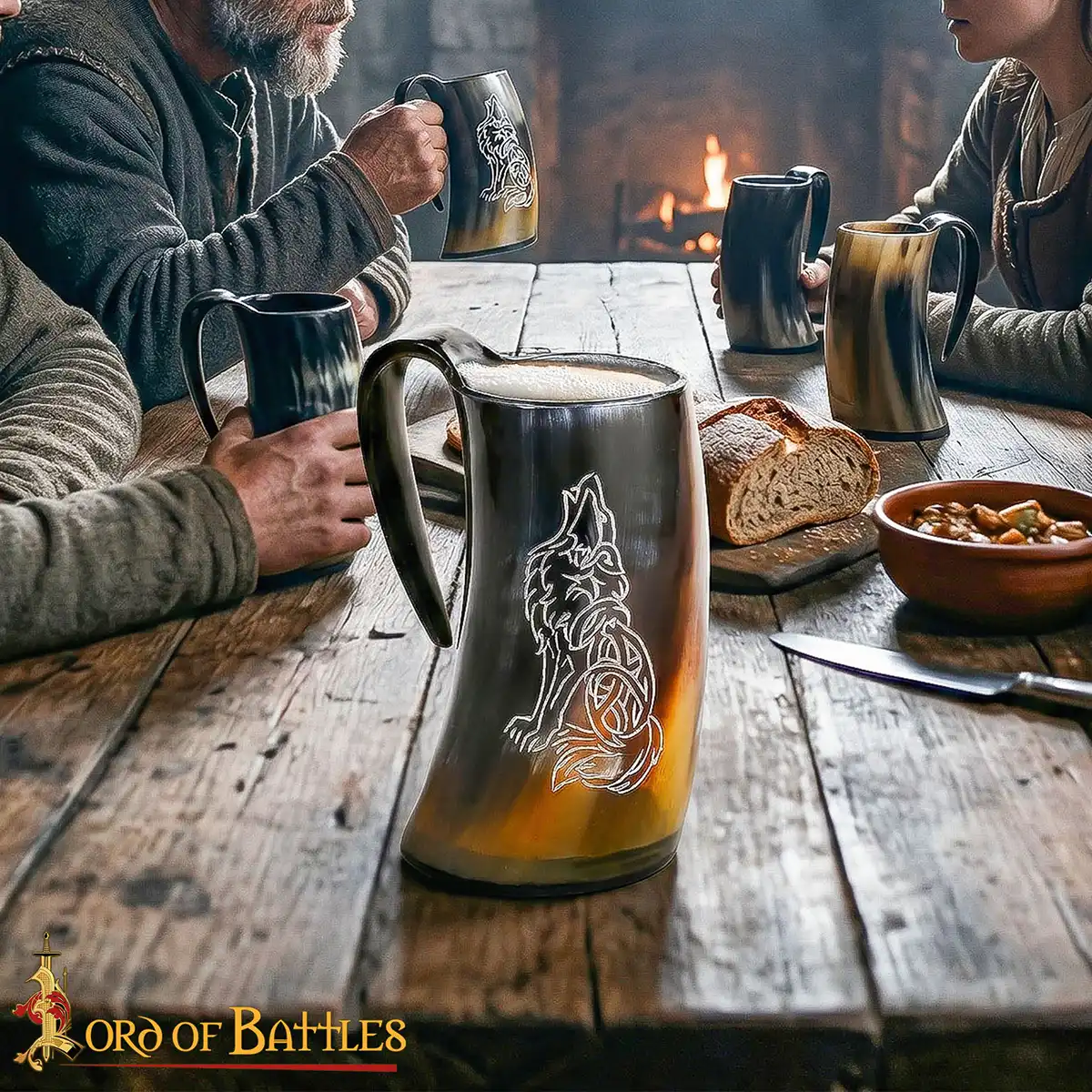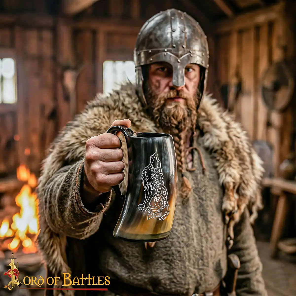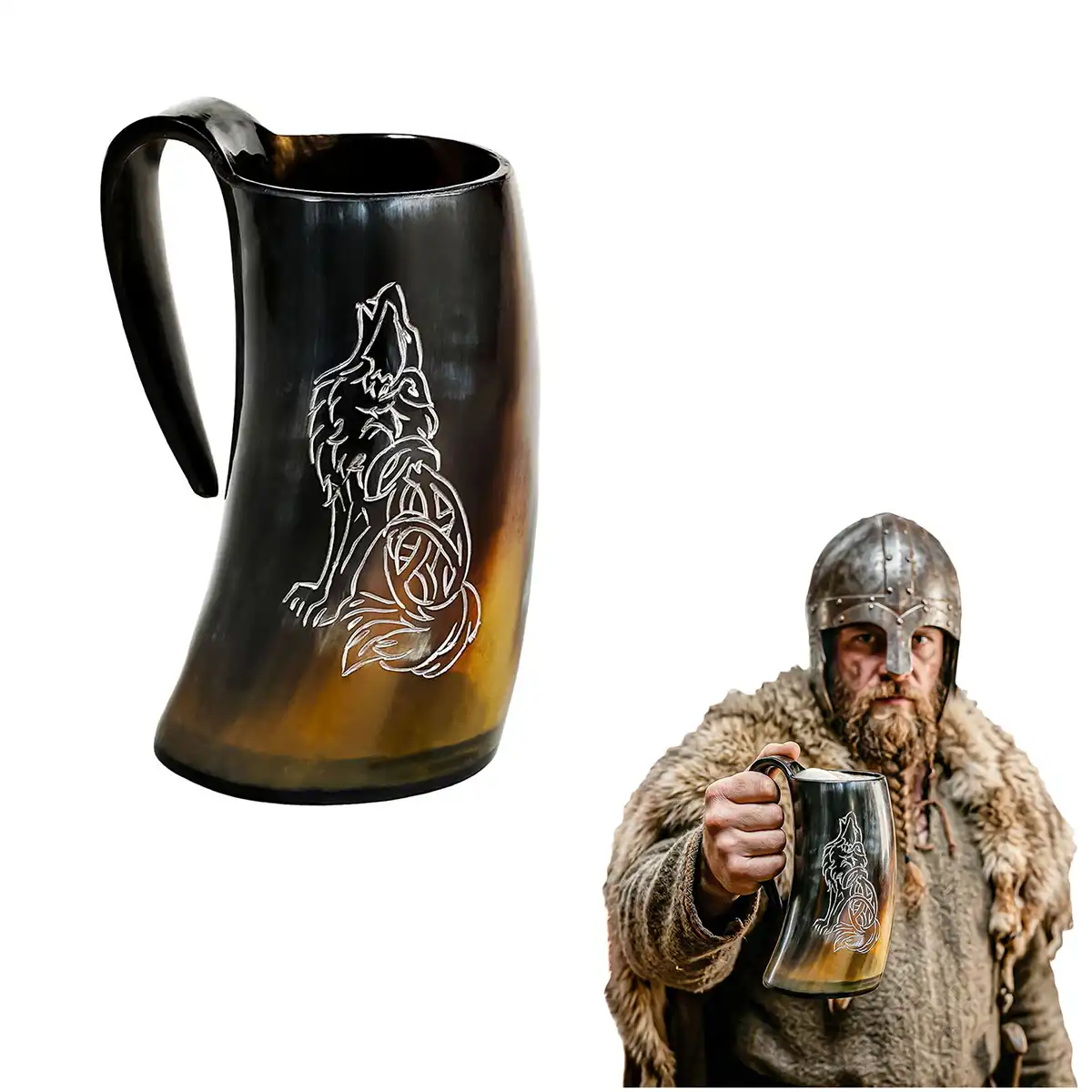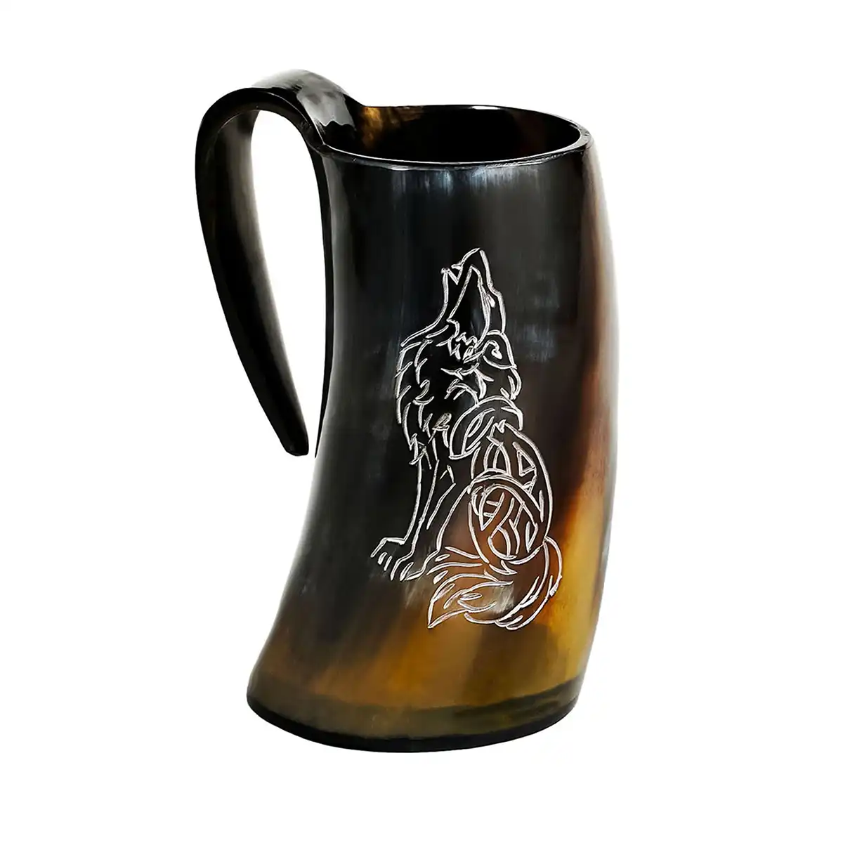 The body has an engraved Celtic wolf knotwork design, symbolizing strength, loyalty, and courage. This detailed engraving shows the visual appeal with Norse and Celtic artistry, making it more than just a drinking mug.