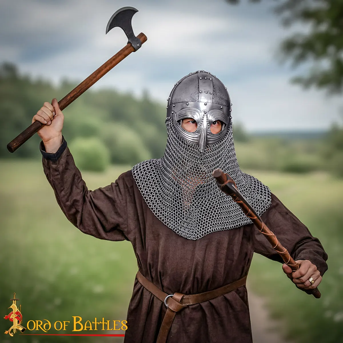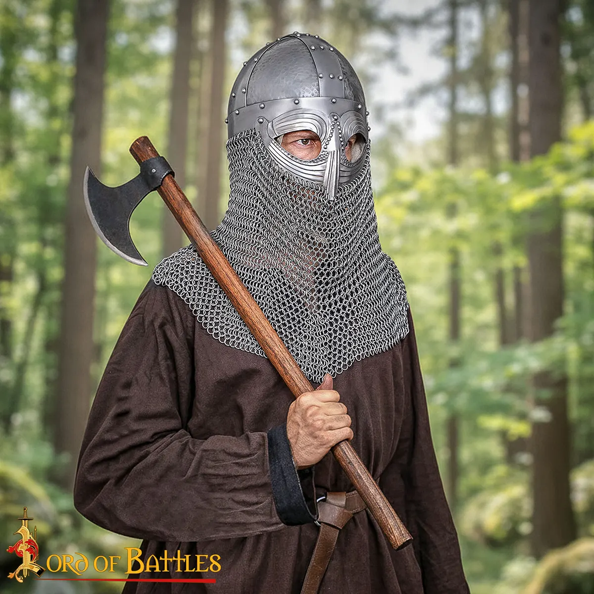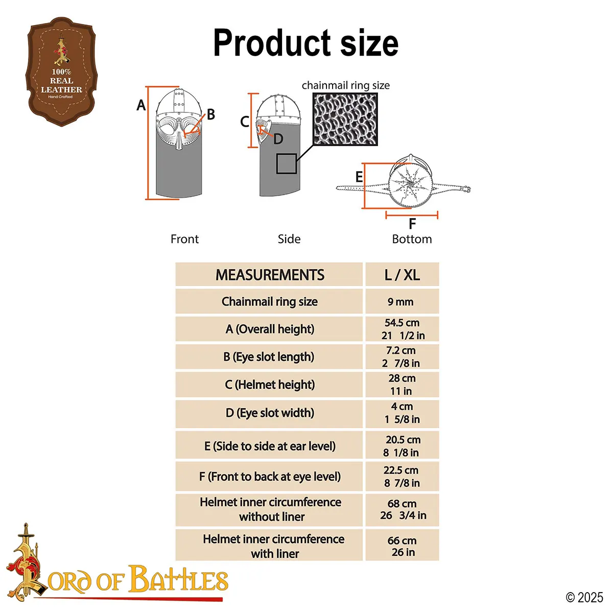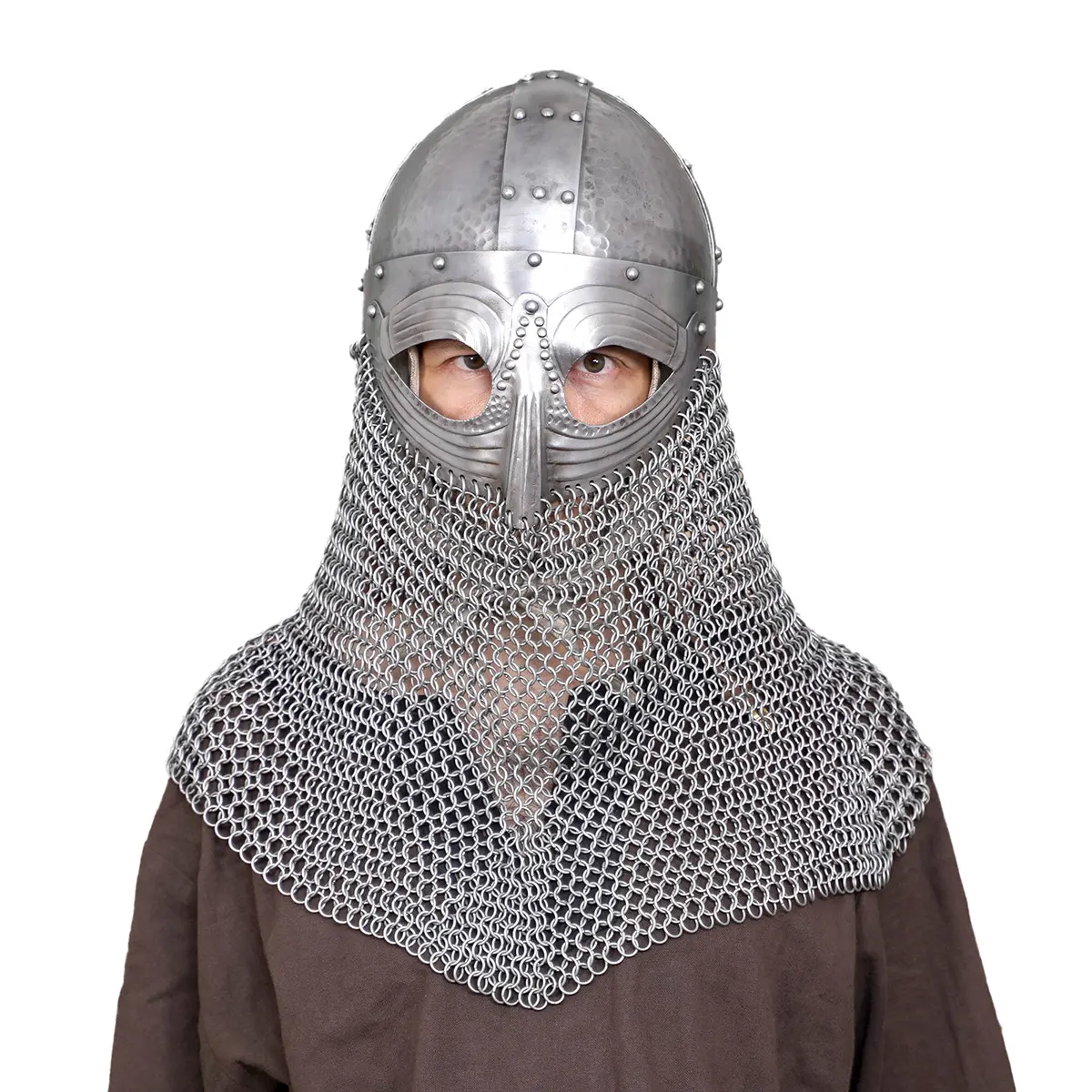 Hand-crafted from 18-gauge mild steel, it comes with a butted chainmail camail made from 10 mm, 16-gauge steel rings that shield the neck and shoulders without limiting movement. Inside, a genuine leather liner provides comfort and stability, even during extended wear or combat.