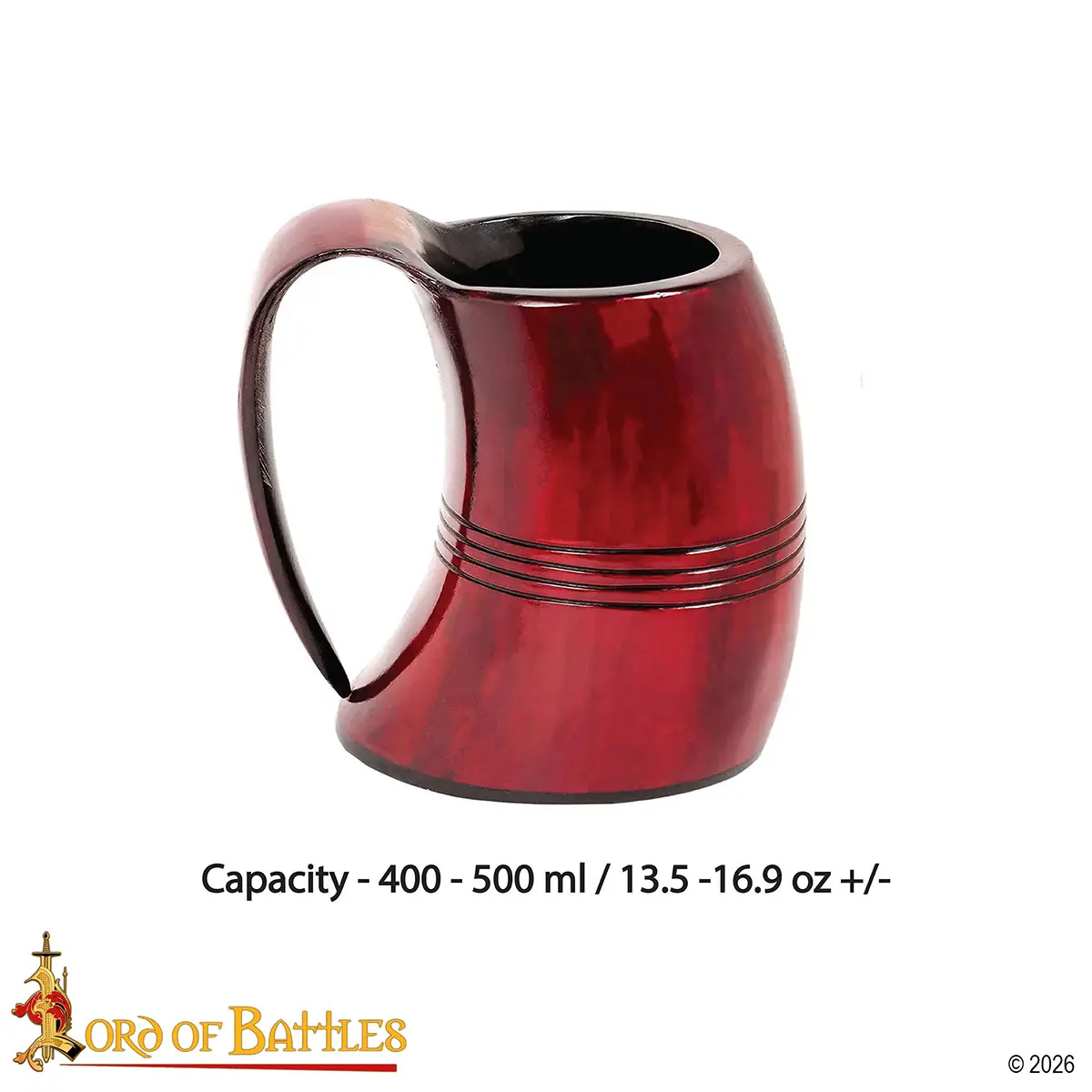 Finished in a rich crimson red color, this tankard mixes historical look with a bold, aesthetic appearance as well. The painted surface enhances the natural horn beneath while preserving its raw color and individuality. No two pieces are ever the same, so each tankard is one of a kind.